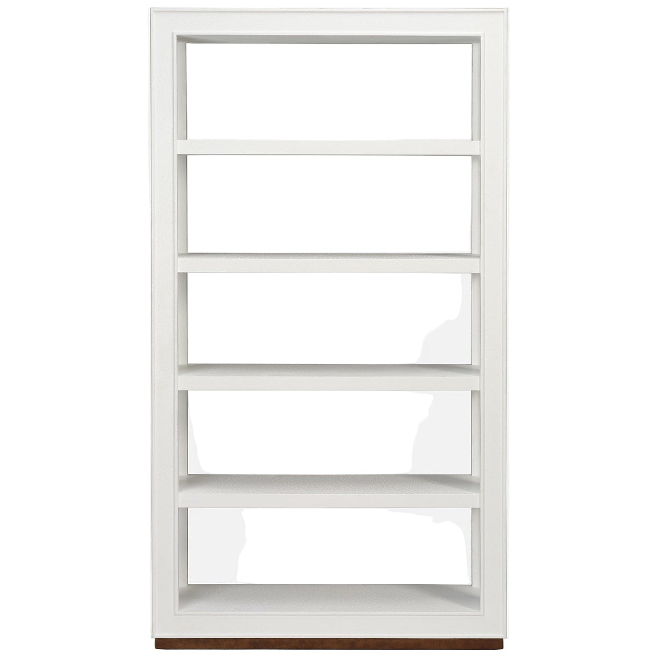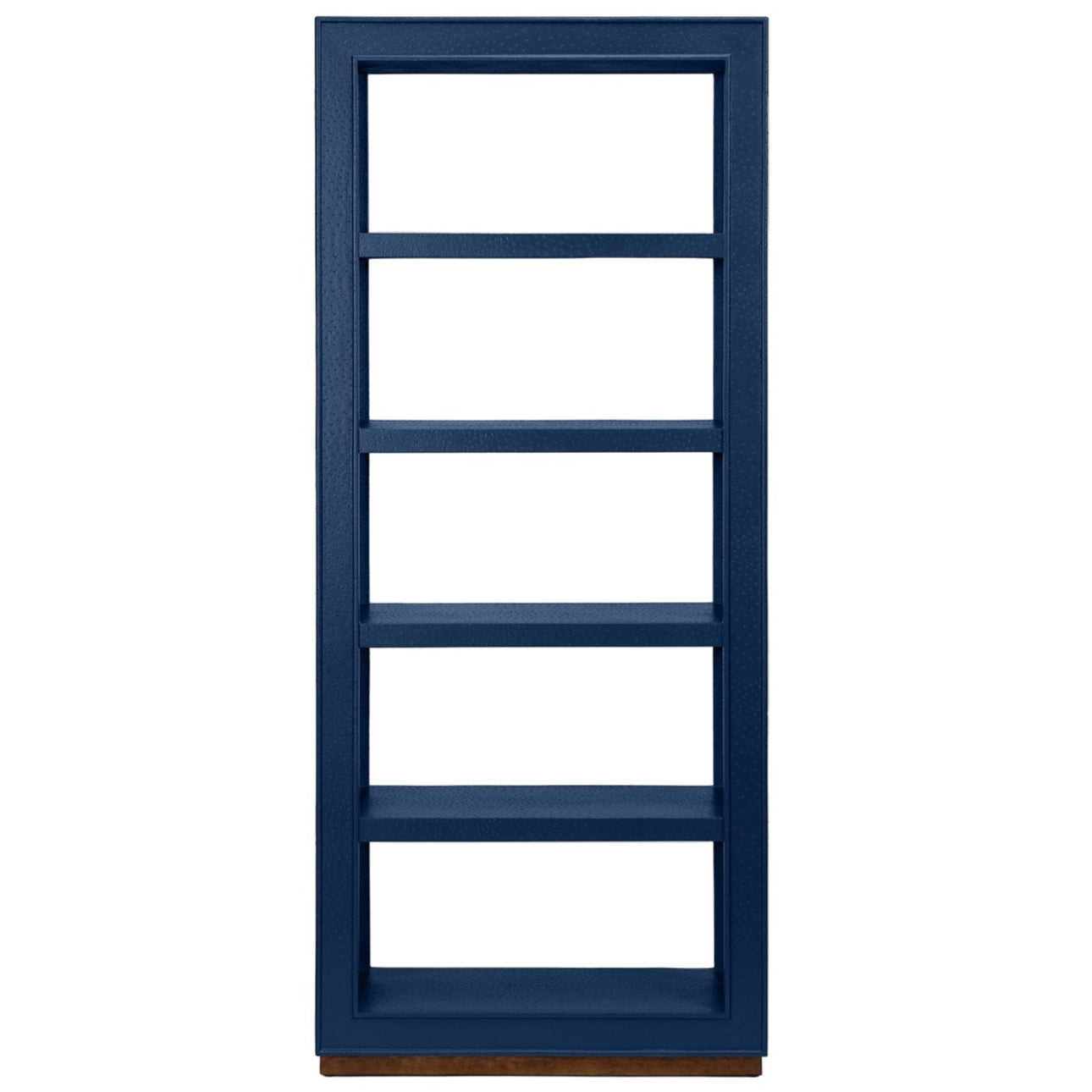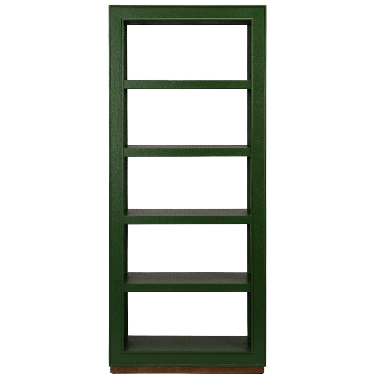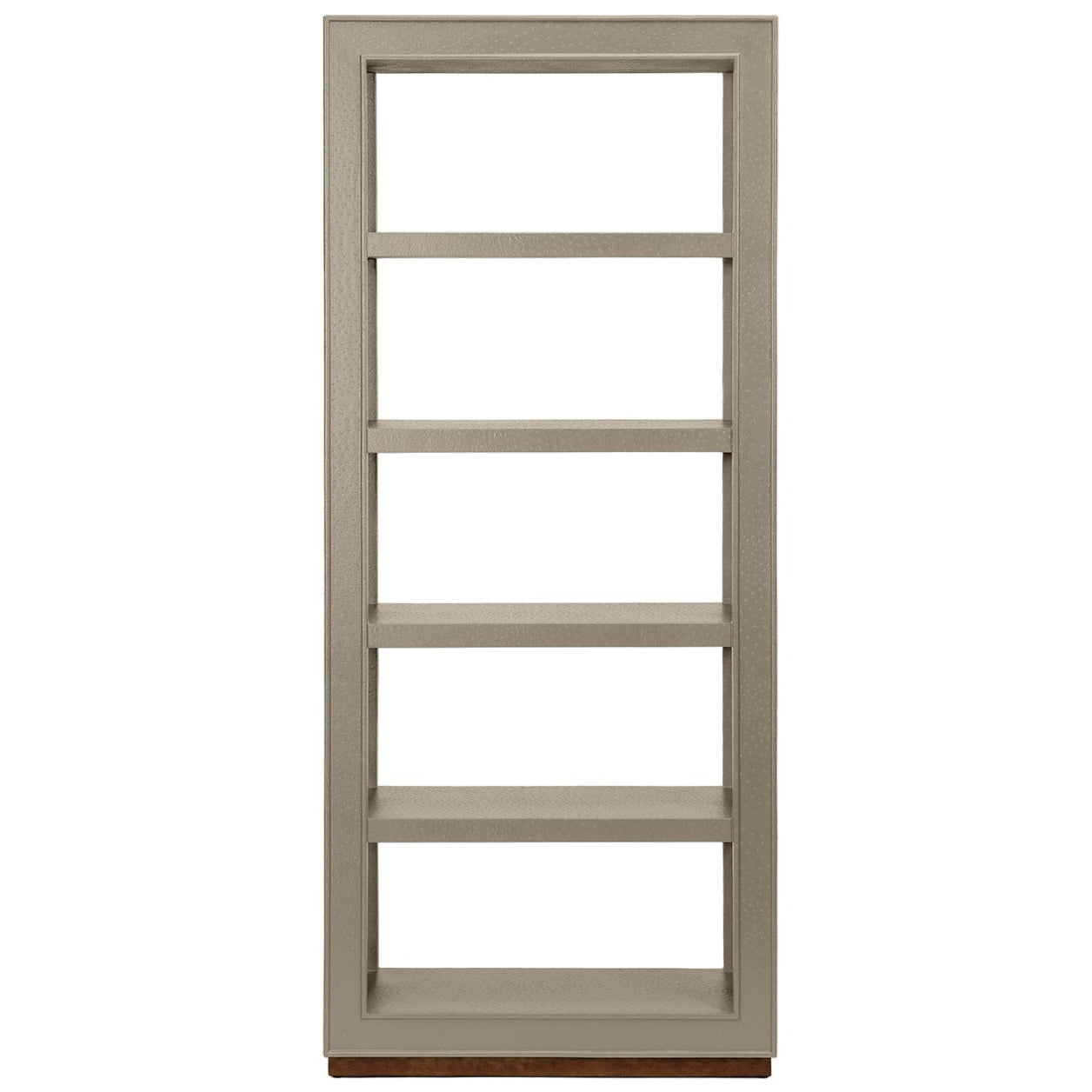 The rich texture of faux ostrich elevates the clean lines of this bookcase. The crisp geometry of its architecture is emphasized by a frame edged in slender molding and the addition of a shelf.