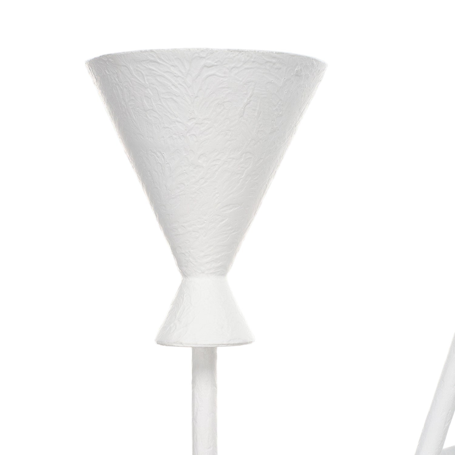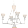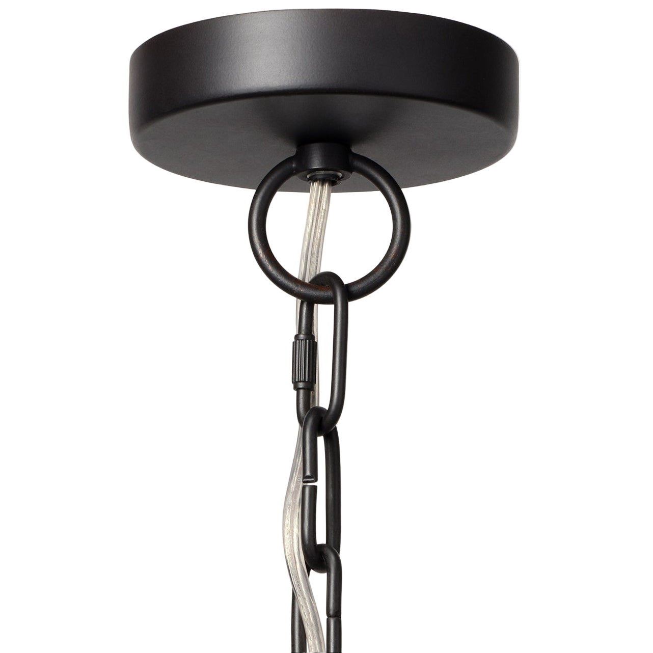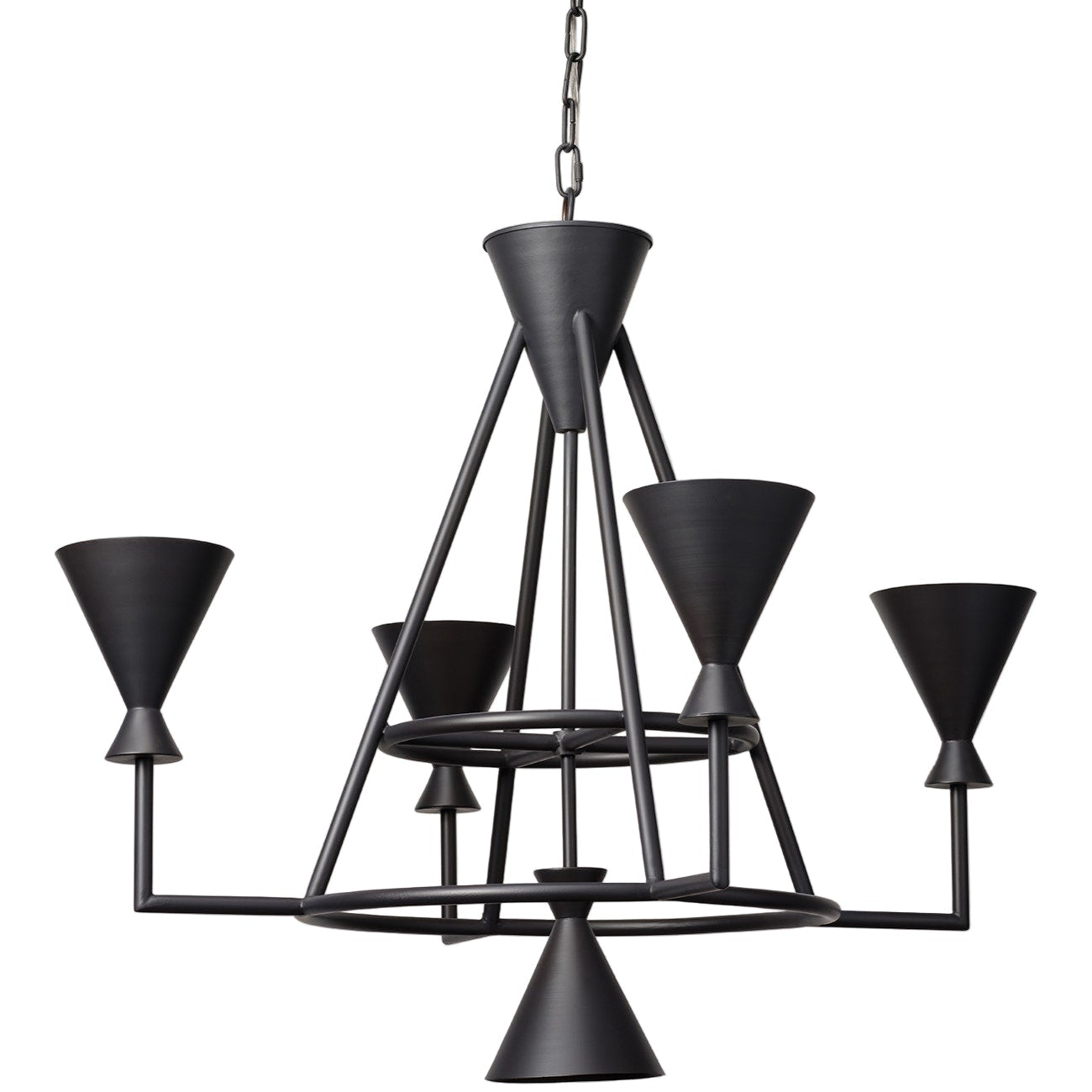 A modern take on a decadent, gothic-like design, the Bristol chandelier brings an enchanting intensity with its geometric shape, textured iron, and cone-like shades.