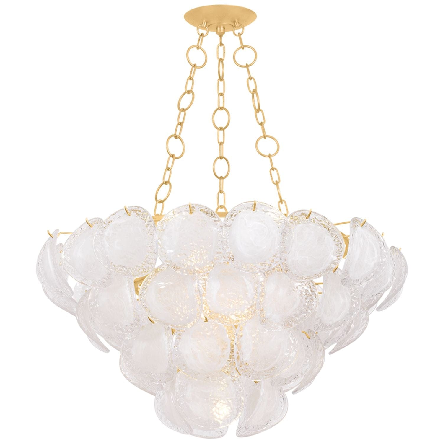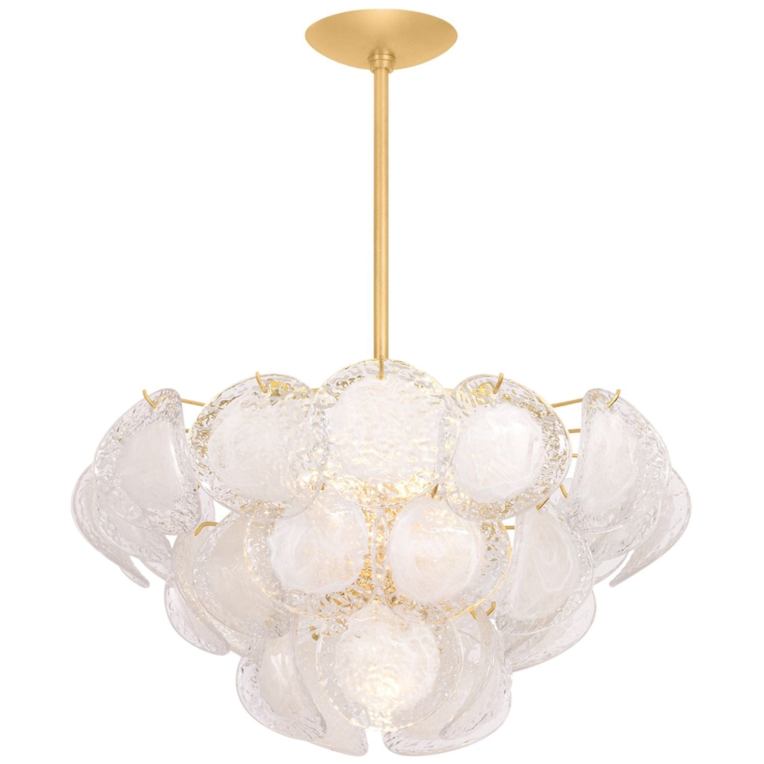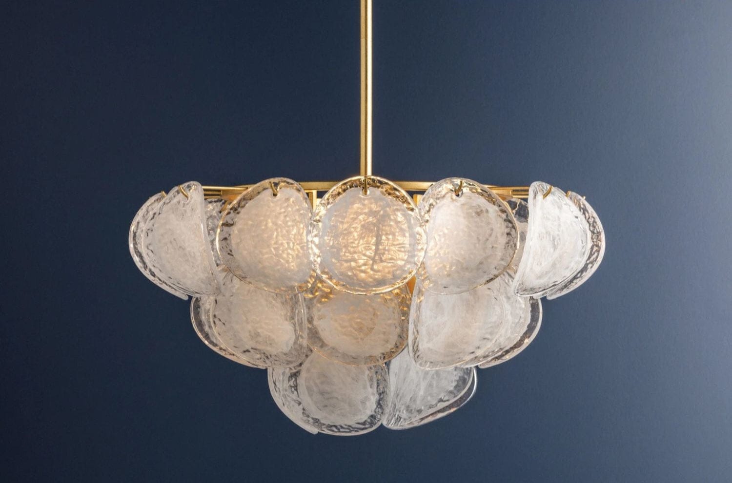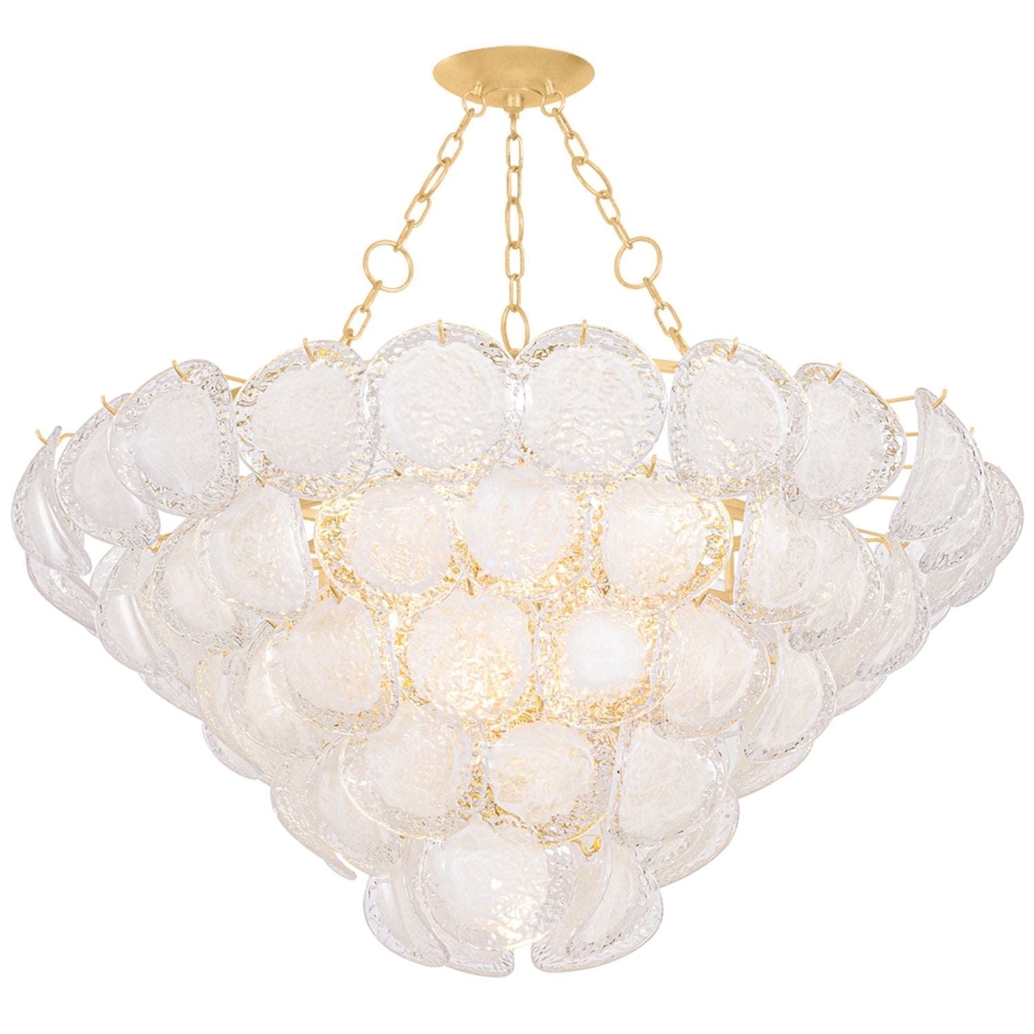 A celebration of maximalism, Cedar Hill is a whimsical tiered showpiece composed of painterly glass panels. Each suspended panel of Blonchino piastre glass curls slightly outwards, adding volume to the composition. Viewed from the side, Cedar Hill recalls a cluster of grapes on the vine; from below, it blooms like a rose. This lustrous fixture is available with 5, 9, or 17 lights with a Vintage Gold Leaf finish.