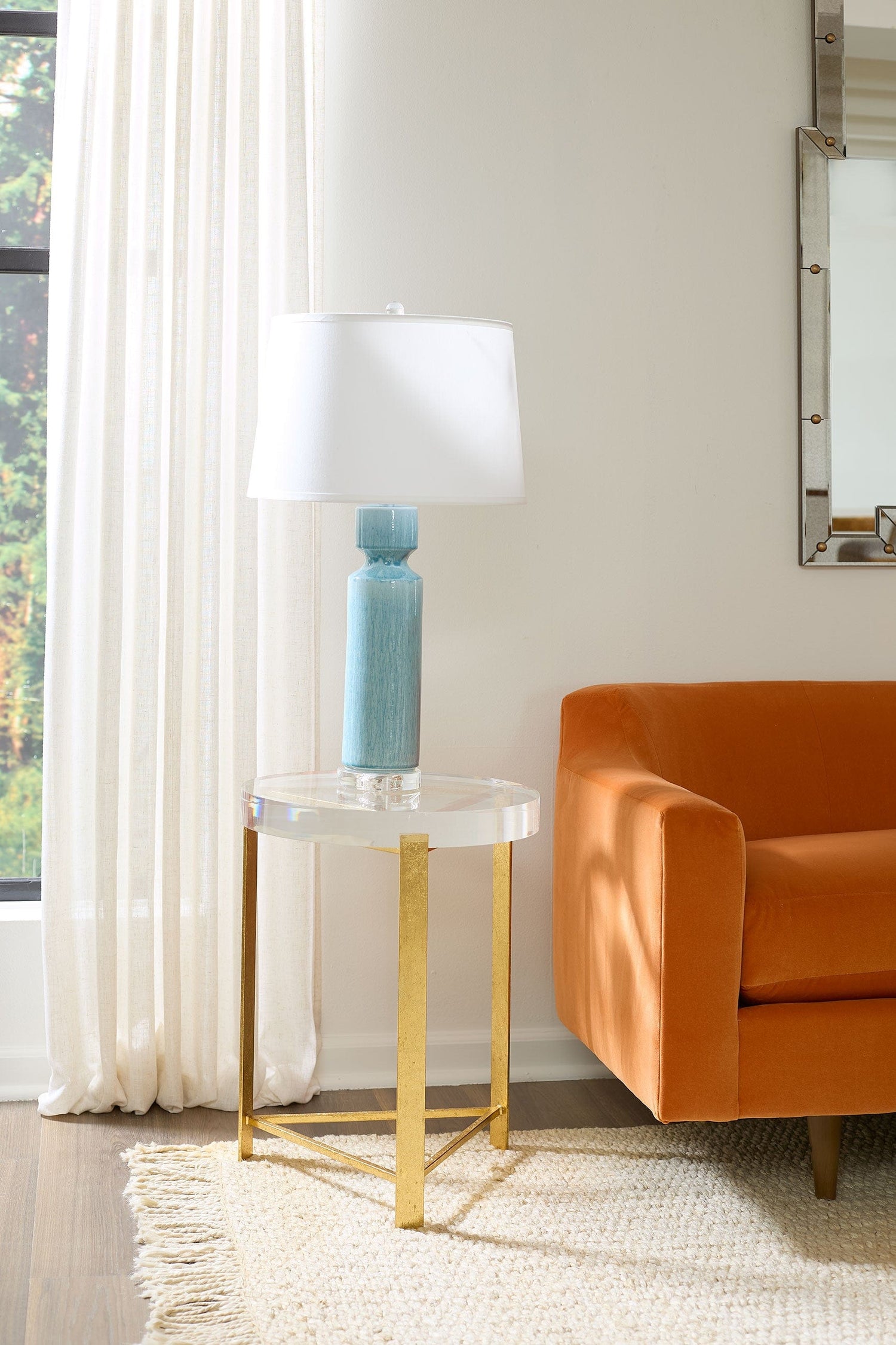 The Corinth Lamp reimagines the classic cylindrical silhouette with a sleek, modern twist. Its long and slim shape exudes understated elegance, while the rich glaze treatment adds a distinctive drippy effect, ensuring each lamp is one of a kind. Resting on a clear acrylic base and topped with a matching acrylic finial, it showcases a contemporary edge. Complete with a nickel harp, the Corinth Lamp is a unique and versatile statement piece.
