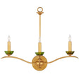 The Flannery Wall Sconce features a classic flowing frame with tapered ends that arc gracefully outward. Hand-forged from wrought iron in a contemporary gold leaf finish, the structure is both sculptural and refined. At each light, recycled green glass bobeches add a subtle pop of color and texture, catching the light to create a soft shimmer. The combination of warm metal and artisan glass gives the chandelier a timeless yet distinctive character. The three-light fixture is dimmable.