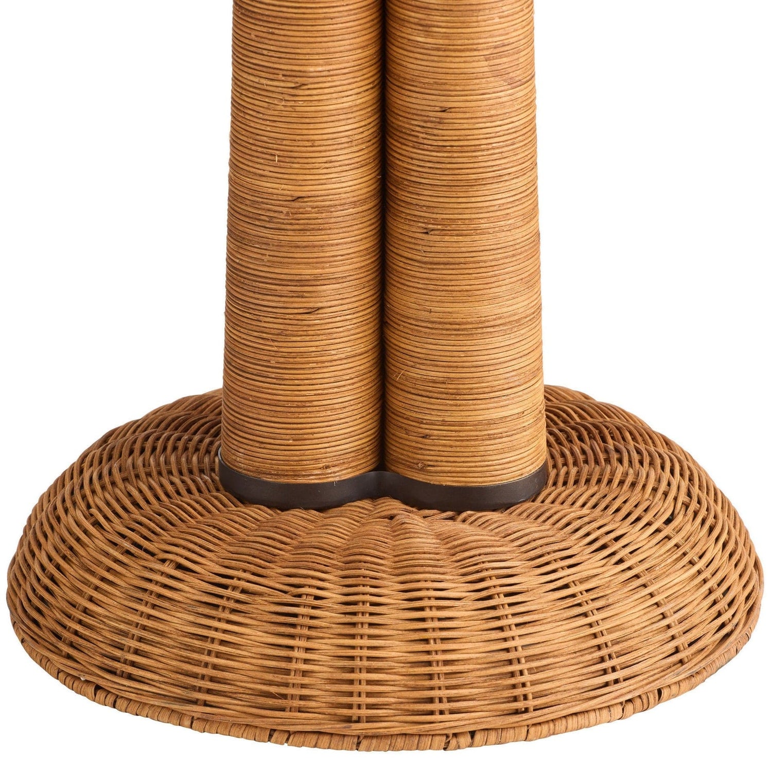 The reinvention of natural materials drove the design of our dramatic floor lamp. Classic wicker woven natural rattan combined with the Italia's muscular leg form topped by arms of English bronze-plated steel that disappear into the matching dome shade. Finish will vary.