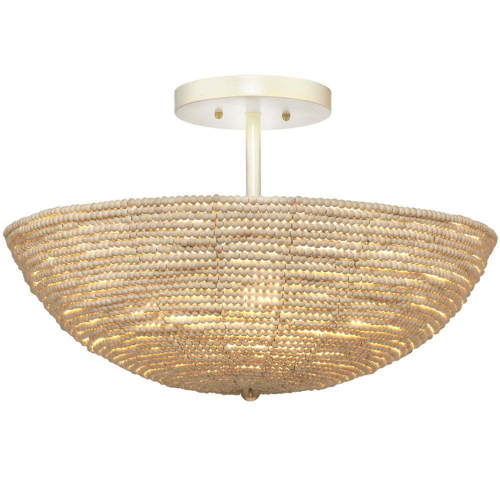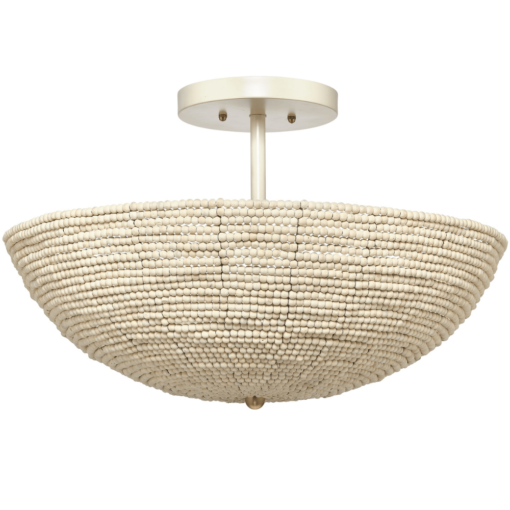 Influenced by both driftwood chunks and beads of beach glass, Jamie’s design brings elements of each to this lovely ceiling fixture. Handcrafted of hundreds of small, smooth mango-wood beads that completely obscure the strong iron frame within, the look is cool, casual, and coastal.