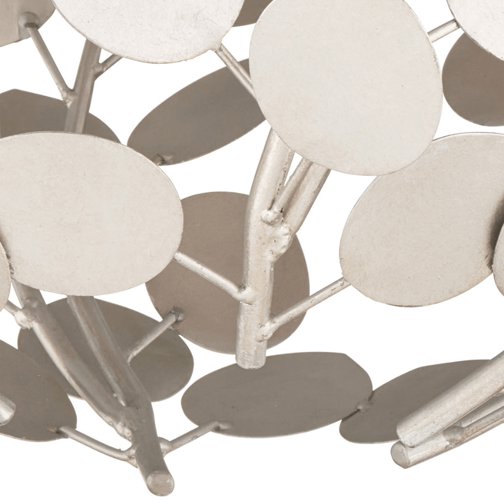 With a lyrical profile of fluttering discs that favor the leaves of its namesake plant, the Lunaria Orb Chandelier is made of wrought iron in a contemporary silver leaf finish. The light from the bulb that illuminates the flowing petals of metal reflect off the finish on this silver chandelier to increase the glow. The nature-inspired creation will add elemental style to a space.