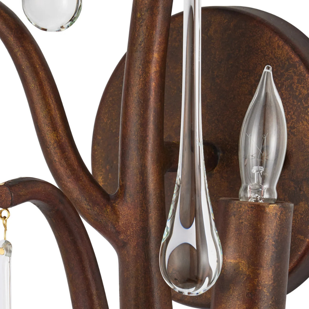 The Morning Grove Wall Sconce is crafted from wrought iron in a shape that resembles a slender, graceful twig. Finished in Rhine Gold, the branch-like form is adorned with elongated crystal drops that hang like icicles, catching and reflecting the light. The combination of textured metal and shimmering glass creates a refined design with a natural edge. The two-light sconce is dimmable for creating a softer glow when desired.