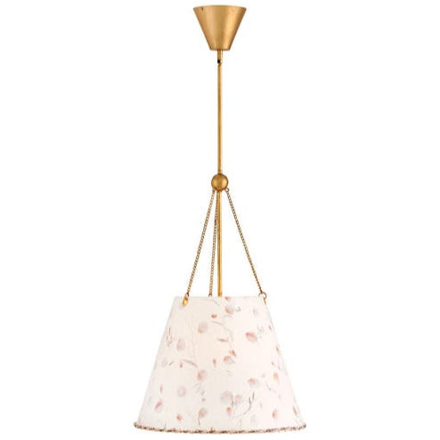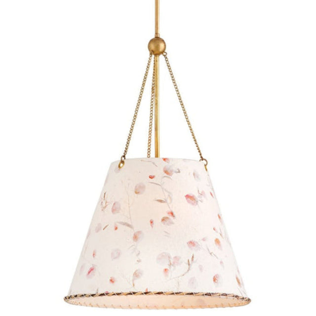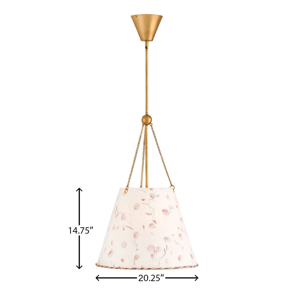 Artisan-crafted from handmade paper pressed with real flowers, Primrose’s delightful shade with twisted rope detailing brings truly unique beauty and cozy ambiance to your space. Its elegant conical silhouette is suspended gracefully from delicate chains, enhanced by a warm Distressed Brass finish.
