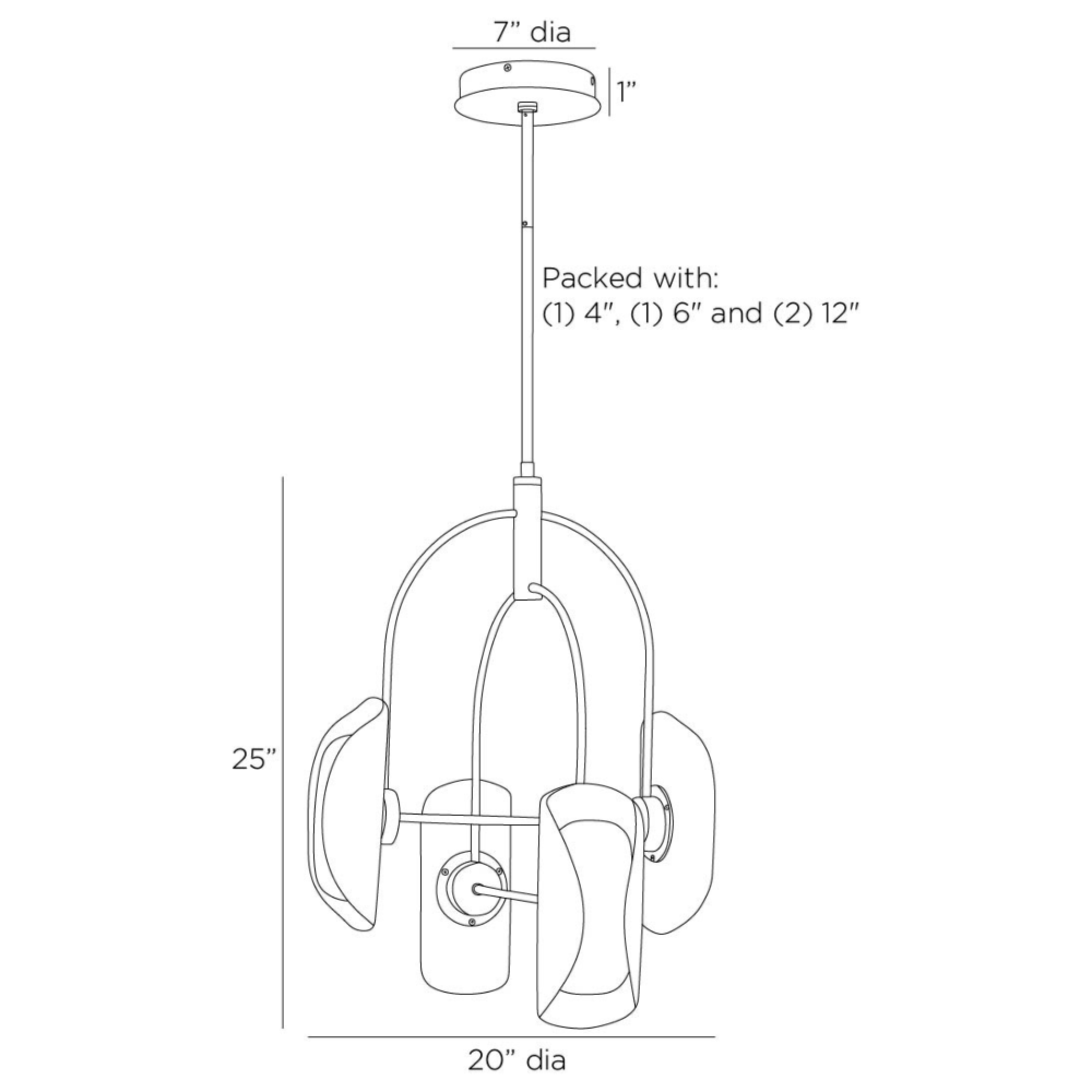 An extension of the popular roll collection, this four-light fixture features soft frosted Opal glass lights ensconced in softly shaped Ivory resin shades and suspends from a curving, antique brass-plated iron frame.
