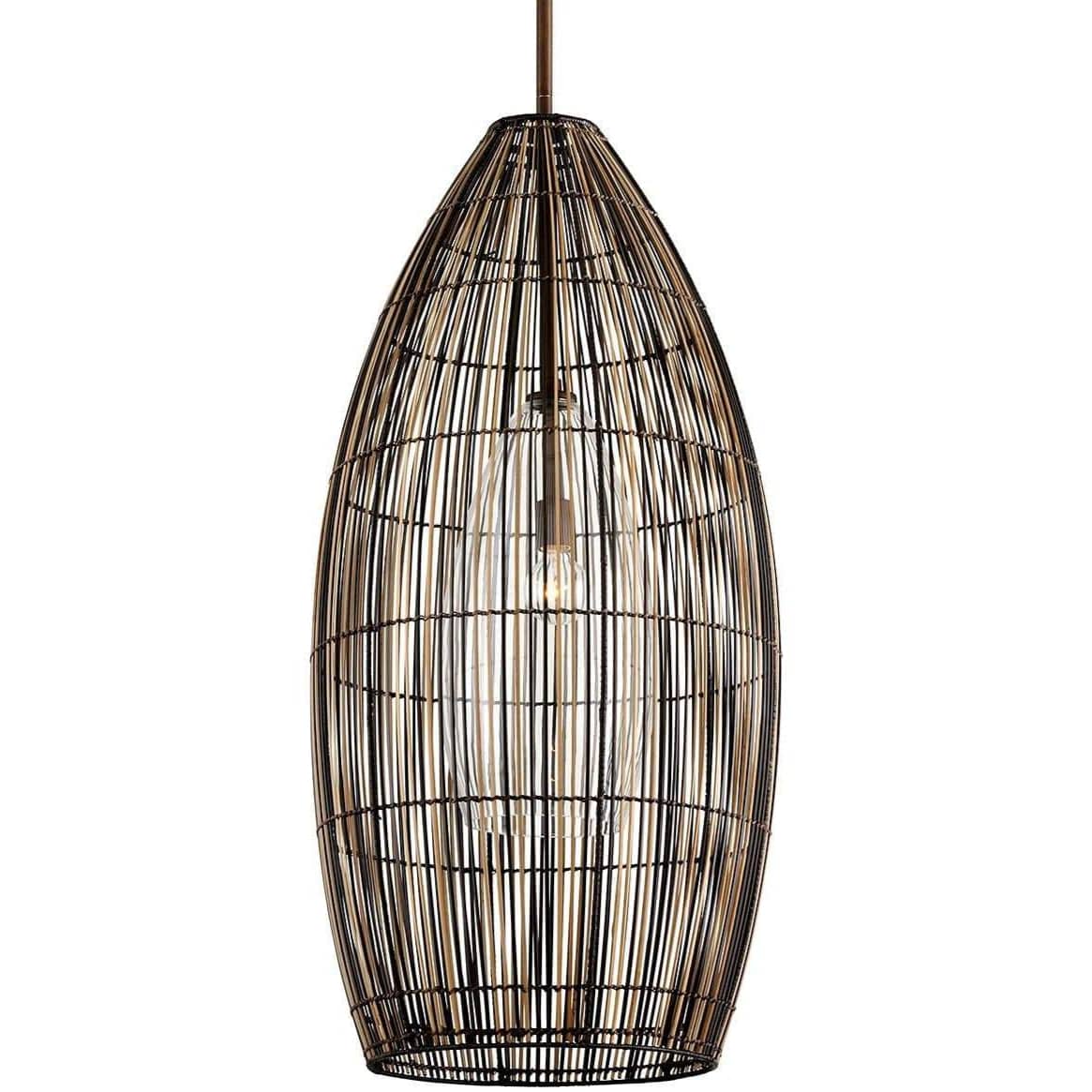An open and airy weave of faux reeds, designed specifically for outdoor use, form a beehive silhouette over a clear glass shade. The twotone finish adds a natural, neutral hint of color. Bring a modern organic style to outdoor living spaces with this beautiful exterior lantern pendant.
