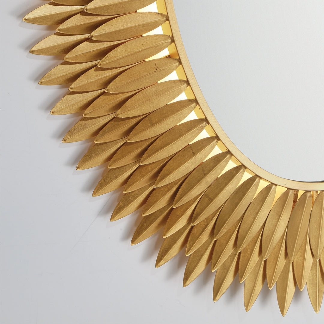 Inspired by Crystorama's iconic Broche Collection, this stunning mirror brings sculptural artistry to wall décor. The mirror features a radiant sunburst design with hand-forged metal leaves arranged to evoke elegance and organic beauty. The intricate leaf-shaped detailing channels a refined sense of nature-inspired aesthetics, adding warmth and charm to any interior. This mirror is ideal as a focal point in entryways, living rooms, or bedrooms, and it pairs beautifully with contemporary and classic design styles.
