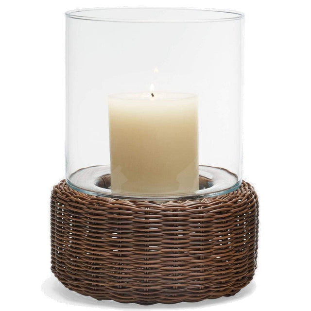 A faux rattan hurricane fit for a outdoor porch or any room that feels like a breath of fresh air. Glass insert included.