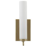 The arcing arm of the Brindisi Wall Sconce defines the gracefulness of this design, the disc-shaped bobeche atop the tubular support serving as the perch for the tall, thin opaque glass canister shade. Made of metal, the cleanly designed wall sconce with its softly glowing white shade is certified for damp locations. Part of the Bagno Collection of wall sconces designed for bathroom spaces.