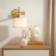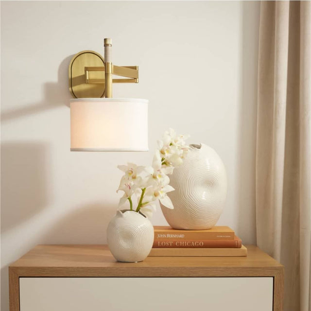 The Stitch sconce is a beautiful alternative to bedside lamps, the sconce features stitched cream leather detaling and a simple oval linen shade, a minimal hinged antique brass-plated iron armature, and inverted light source to cast a soft glow wherever it is needed.