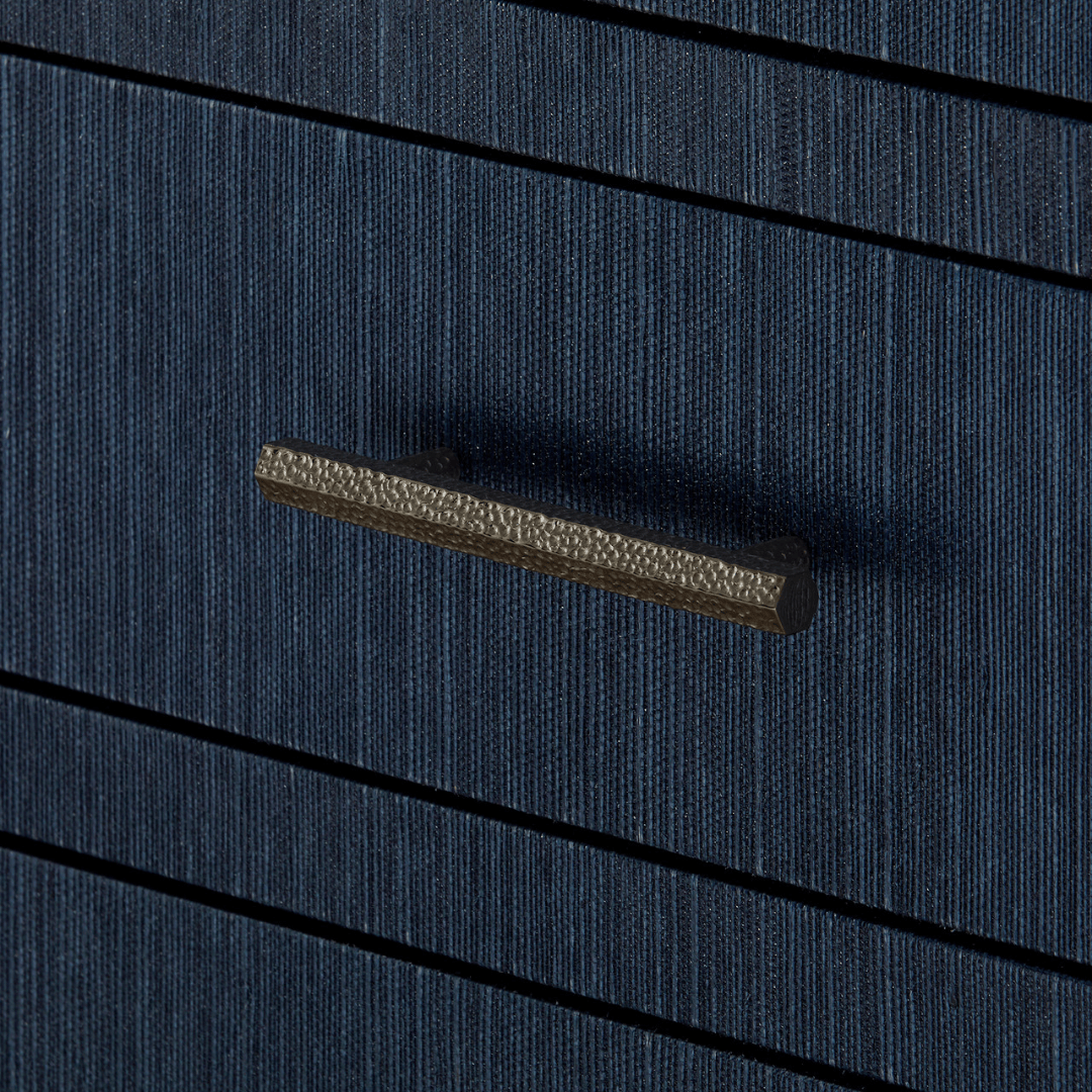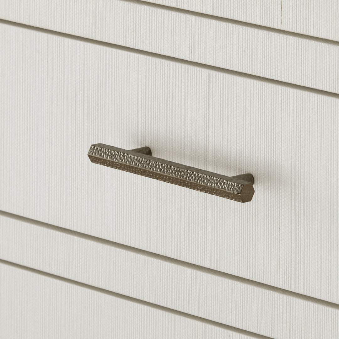 The Florence 4-Drawer Side Table showcases clean, rectilinear lines. The grasscloth-wrapped collection is coated in a clear lacquer finish, which highlights the natural texture and imparts a subtle sheen. Thoughtfully designed for both style and function, this spacious piece features four drawers that graduate in size—smaller, shallower drawers at the top for delicate items and deeper drawers below for larger items. With satin-finish bronze pulls, the dresser strikes a balance between tailored structure and refined warmth.