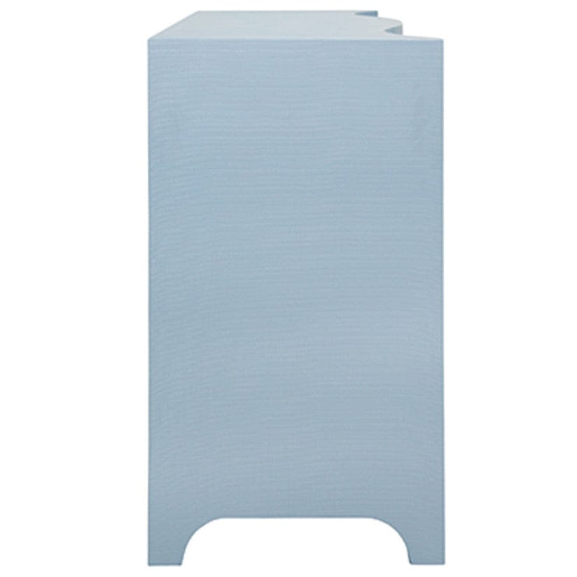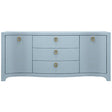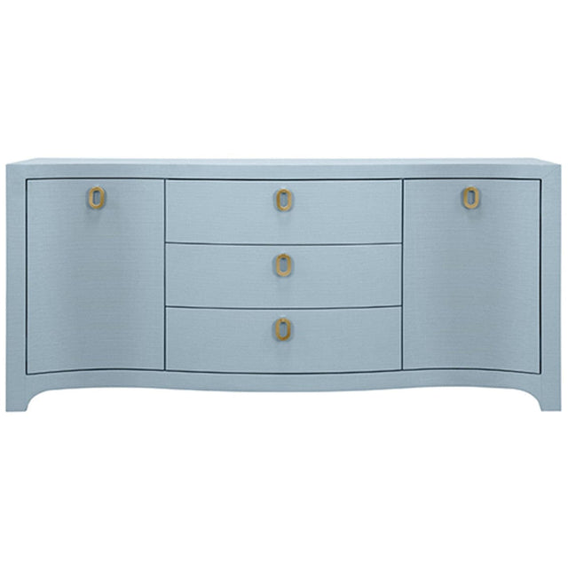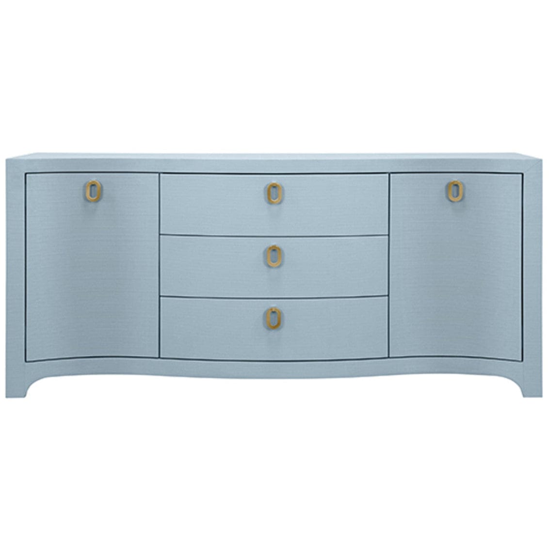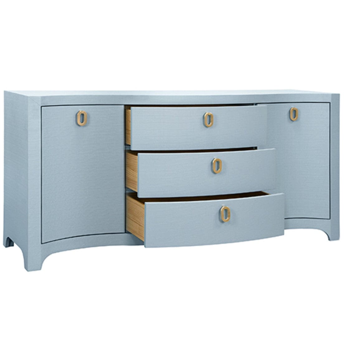 Elegant and sculptural, the Paulina curved-front buffet brings refined texture and graceful form to any dining or living space. Paulina is gracefully wrapped in textured linen, softened by its gently bowed silhouette and elevated by the subtle sheen of satin brass ring pulls. Two doors and three drawers offer versatile storage, seamlessly blending function with high-end design. With its crisp palette and tailored detailing, this buffet makes a sophisticated statement while maintaining an air of relaxed elegance.