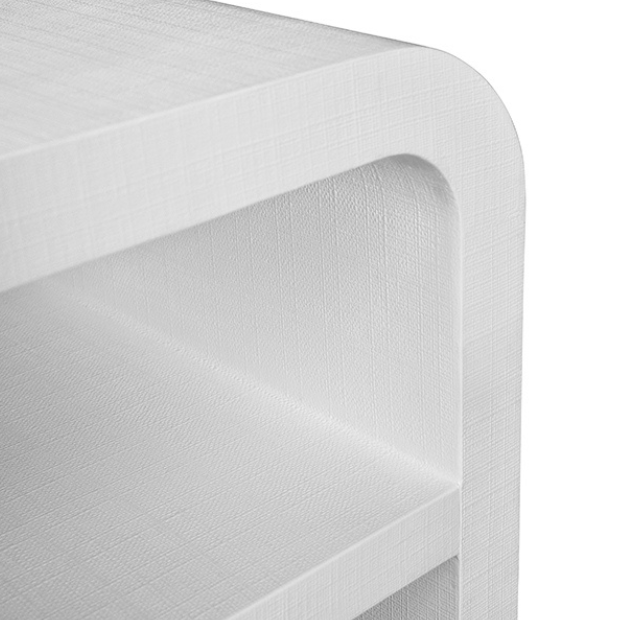 Our mid-century modern, waterfall console table stands out in a crowd. Arcing silhouette and rich, book-matched burl veneer or textured white linen speak to one-of-a-kind, old world craftsmanship. Shelf provides additional stability and storage. As a dramatic centerpiece, Marshall sets the tone for a luxurious, high style living space.