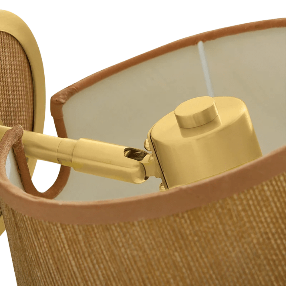 Responding to the seasonal trend for tactile, blond naturals, the Abeni sconce makes use of woven grasscloth on both its shade and backplate. The oversized proportions and rustic materiality give this sconce a casual feel while the Aged Brass accents lend a luxe note. The head of Abeni pivots for use as directional light at the bedside.
