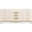 A modern interpretation on refined neoclassic design, this dresser is generously sized with twelve, self-closing drawers. It maintains its gracefulness with dramatically curving lines on the front and sides, as well as beautifully carved trapezoid feet. The Washed Alabaster maple case is offset by three inset handles in the center drawers that are carved in the shape of elongated astroids. The base of the piece is trimmed with the collection’s carved ribbon motif in shimmering Blush Taupe. Inside each of the top drawers is a delicate stencil print that adds to its charm. The Adela Dresser is perfect for a refined bedroom.