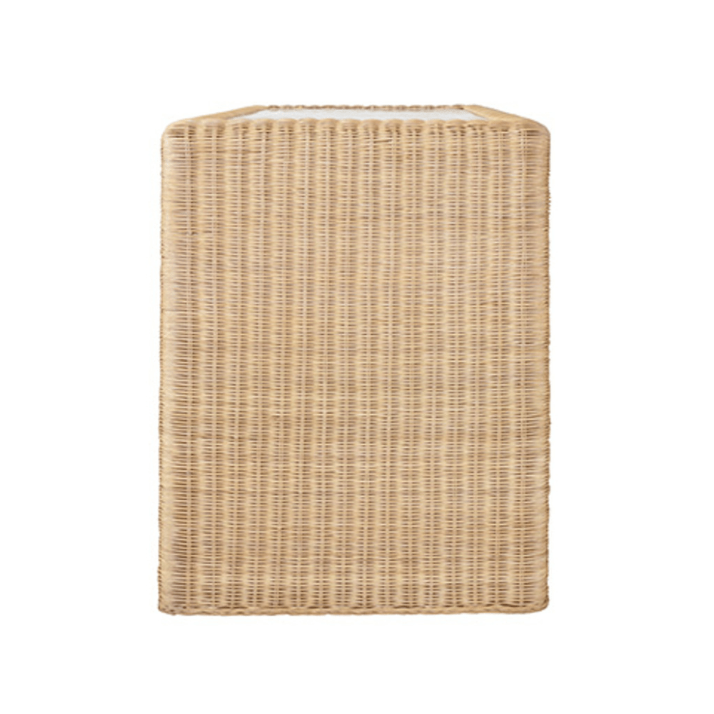 Two drawer waterfall edge desk in woven rattan with inset glass top