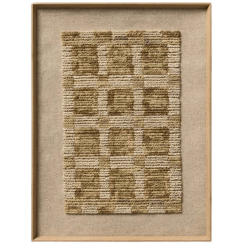Ready-to-hang Descanso wall art from Amber Lewis x Loloi features a hand-tufted wool textile with a broken stripe pattern in an earth-toned palette, measuring 42” x 32”. The artwork is made in India and custom-framed in Dallas, Texas.