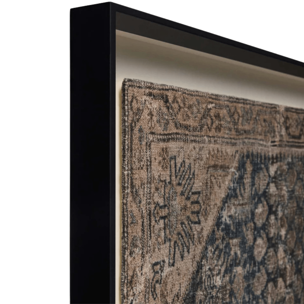 Pismo wall art from Amber Lewis x Loloi features a vintage-inspired printed textile with a deep, moody color palette, measuring 28” x 56”. The artwork is made in India and custom-framed in Dallas, Texas.