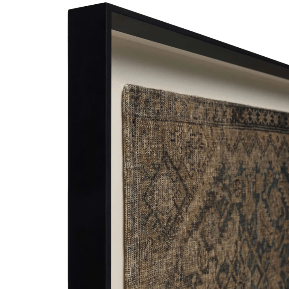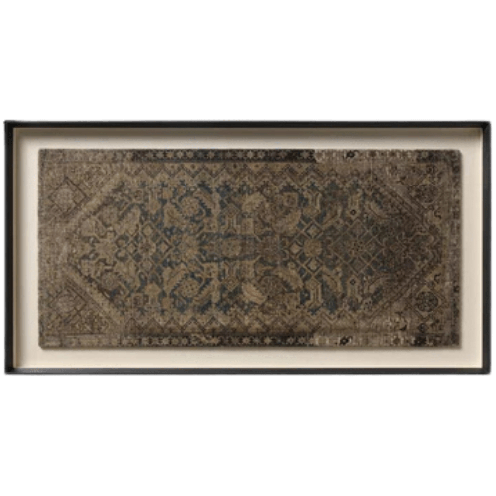 Shasta wall art from Amber Lewis x Loloi features a vintage-inspired printed textile with a deep, moody color palette, measuring 28” x 56”. The artwork is made in India and custom-framed in Dallas, Texas.