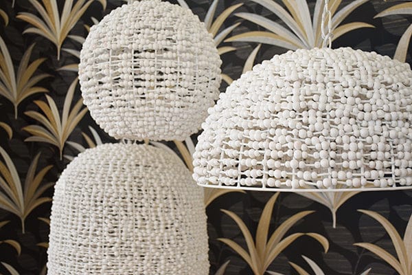 Elongated dome shaped pendant wrapped with whitewash wood beads
