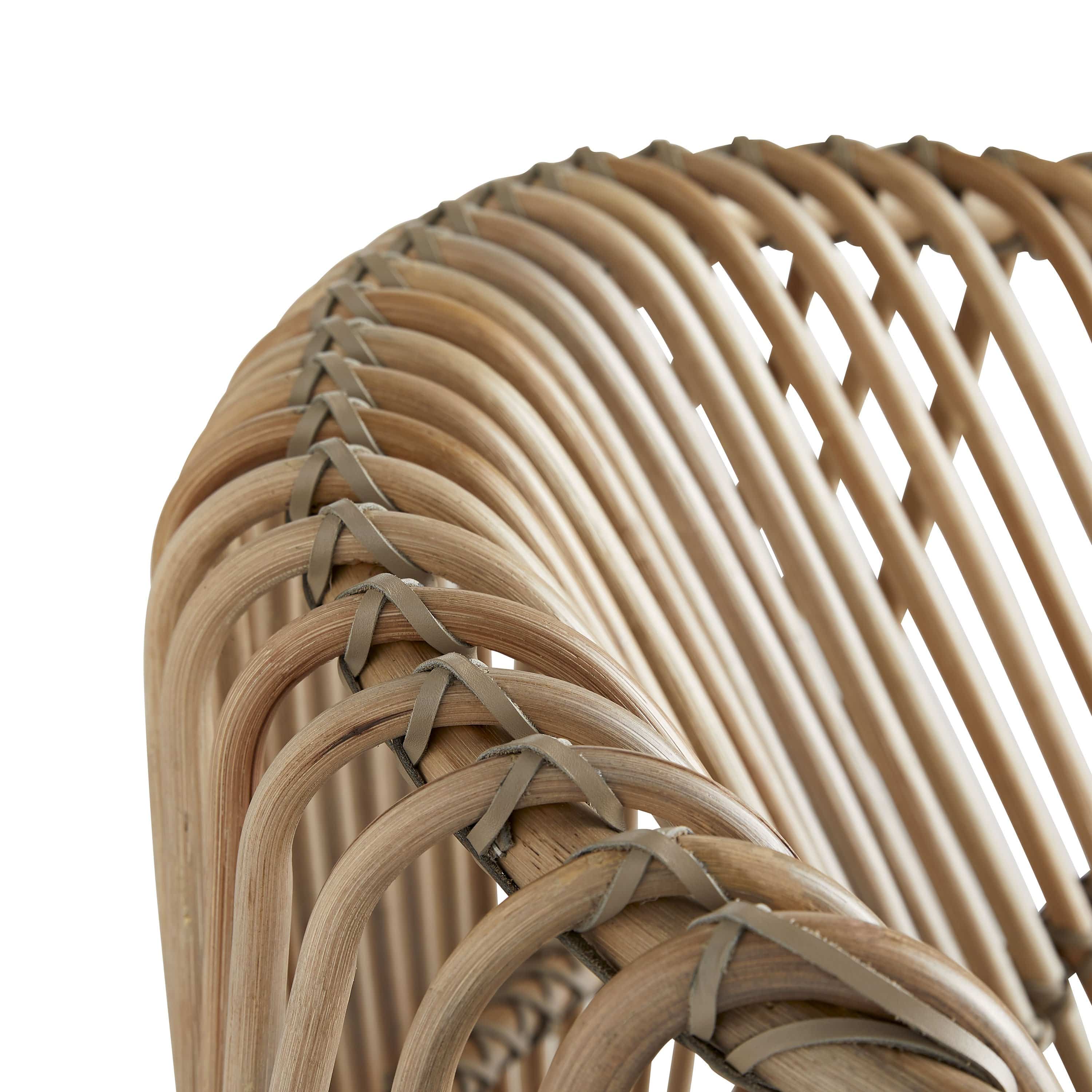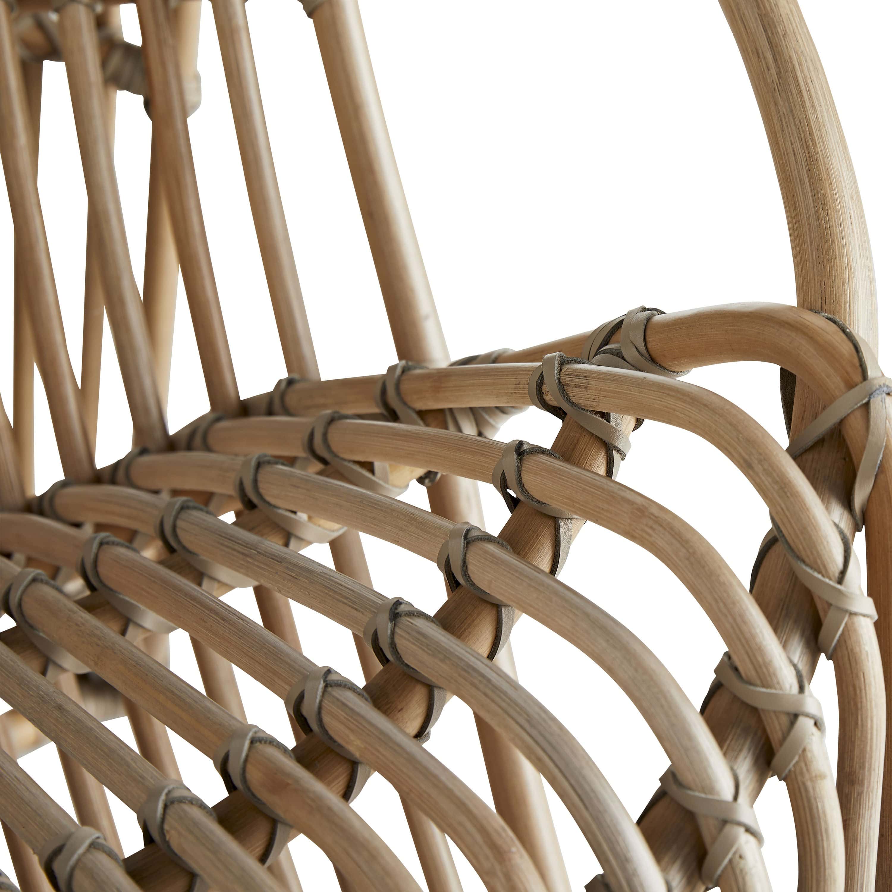 Rich with sweeping lines inspired by Spanish architect Santiago Calatrava's World Trade Center Hub, known as the Oculus, this chair delivers an undeniably unique style. Rattan poles with light gray leather bindings are shaped over a circular frame creating a deep seat with curves that hug you from every angle. The negative space creates an airy volume. A gray wash finish accentuates the organic materials and adds an extra element of natural class.