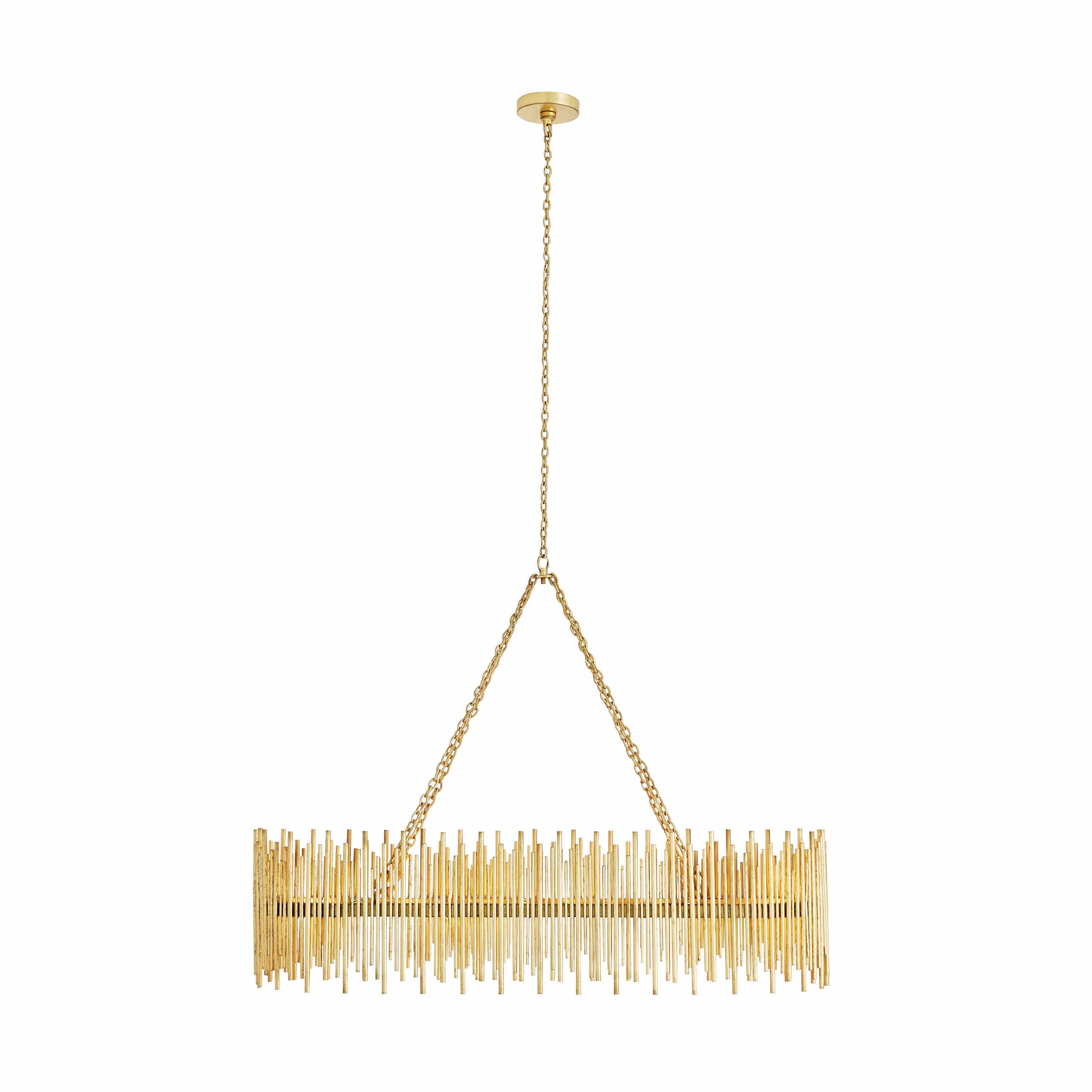 Individual iron rods are welded together and hand-finished with gold leaf to create this stunning oval-shaped chandelier. The entire piece is leafed, all the way up to the ceiling mount. Rustic, yet undeniably elegant. Sheds so much light with ten standard bulbs. Gold leaf finish may vary. Damp-rated, although limited covered outdoor conditions may affect finish.