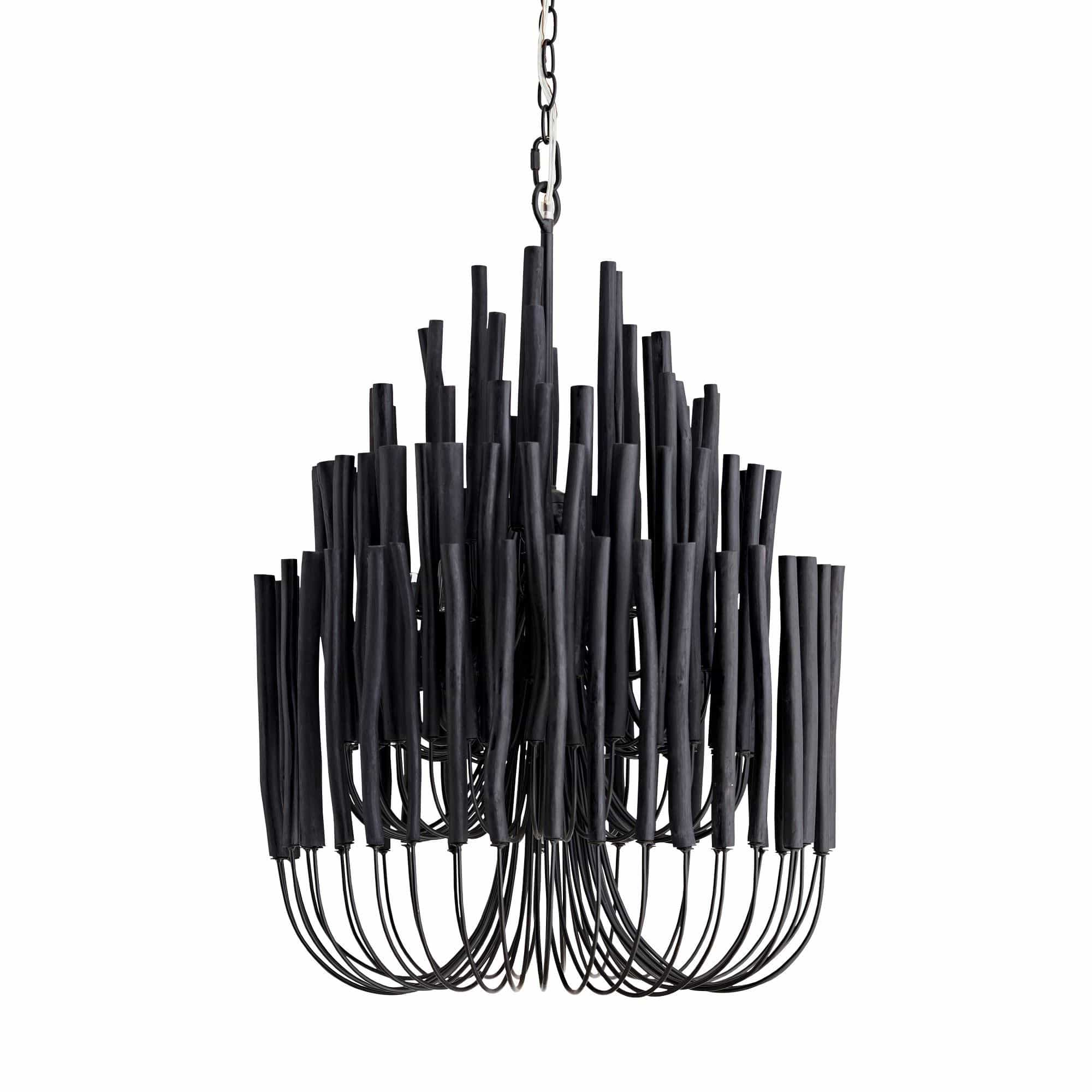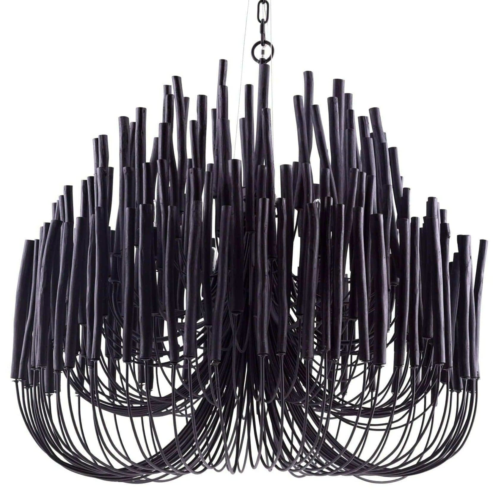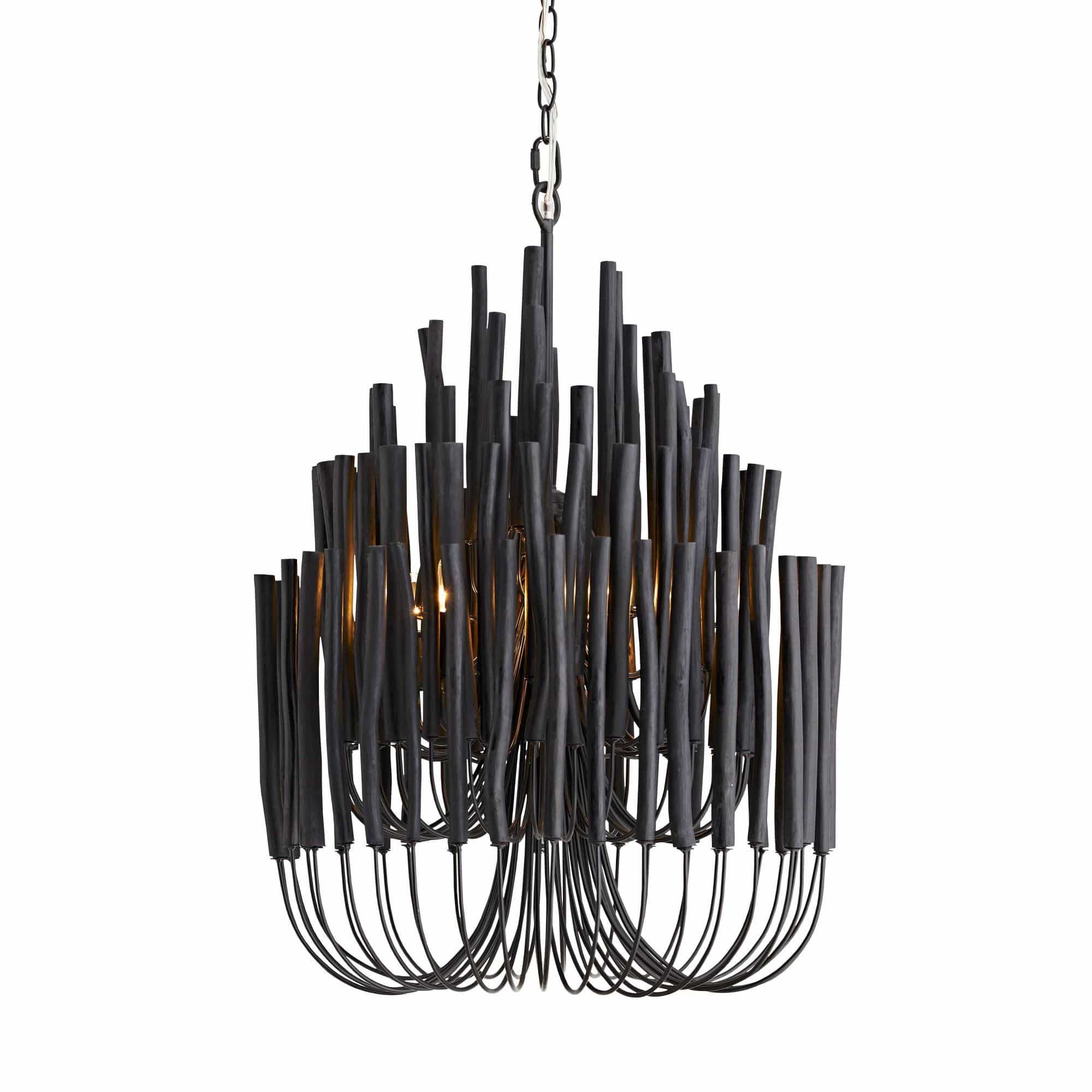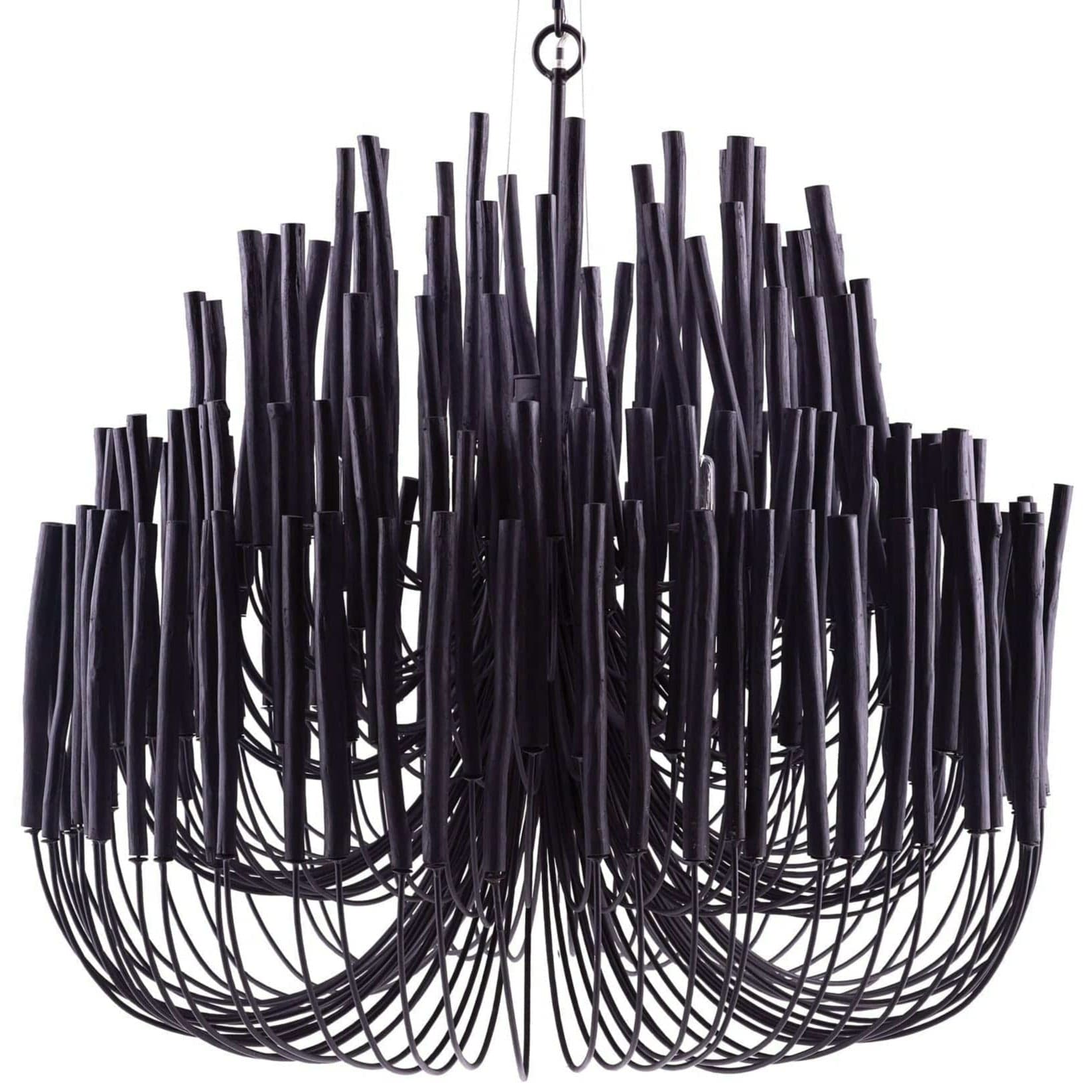 This rustically refined chandelier instantly transforms a space. The multi-tiered form features wooden dowels, finished in black, on curved and pliable iron arms. The wooden rods will arrive with a series of inherent fissures and cracks that will widen and multiply over time. This is considered a natural occurrence and is both beautiful and intentional. During installation, please ensure the bulbs are not in contact with the wooden components by gently adjusting the arms to create a one-inch minimum distance between the dowels and bulbs. Each piece will vary in size, shape, and finish.