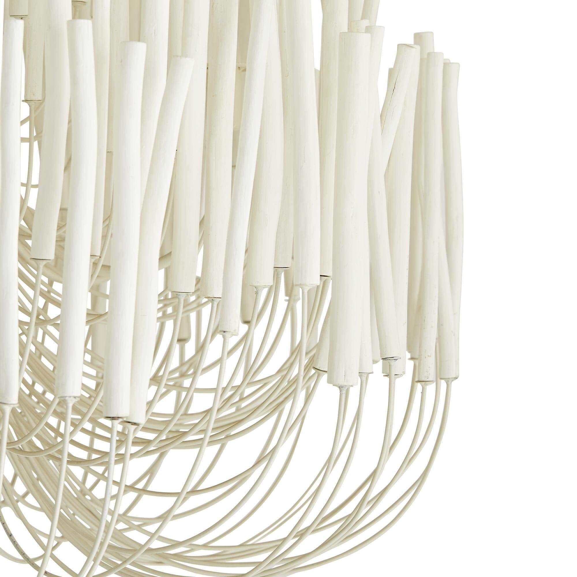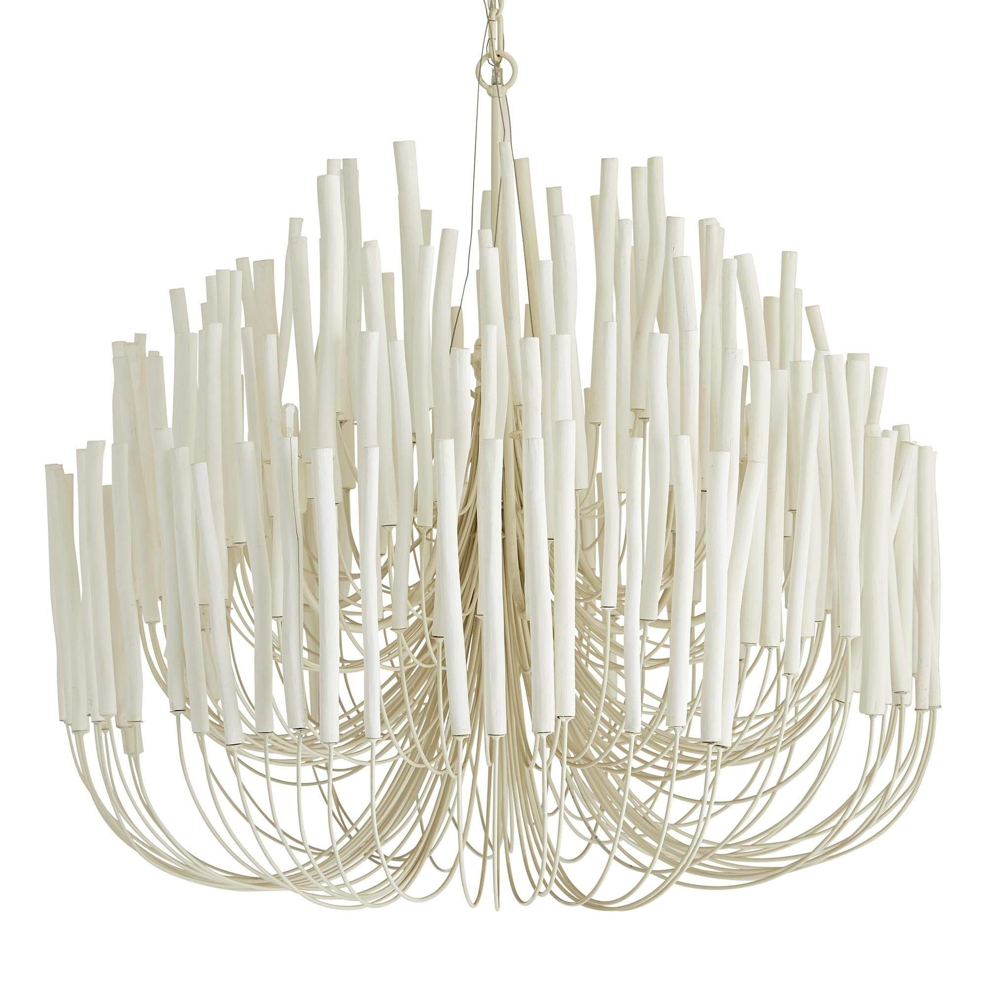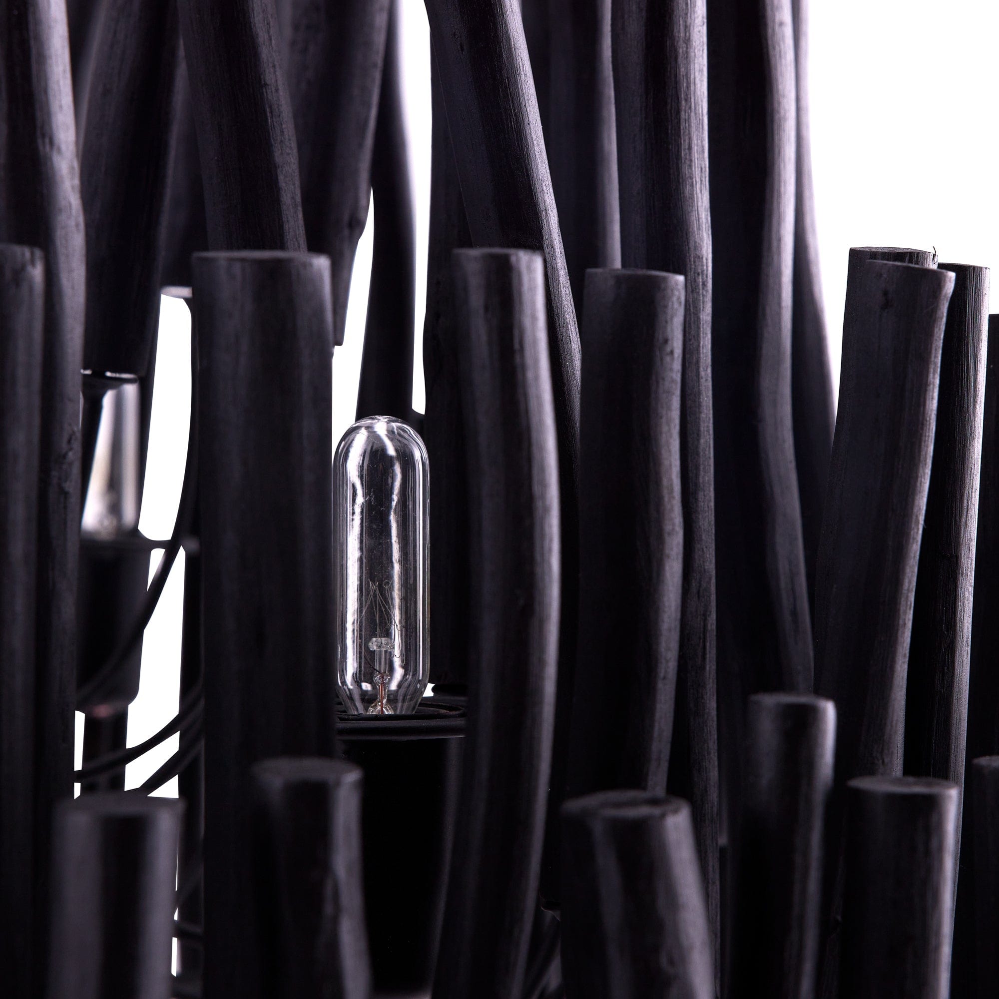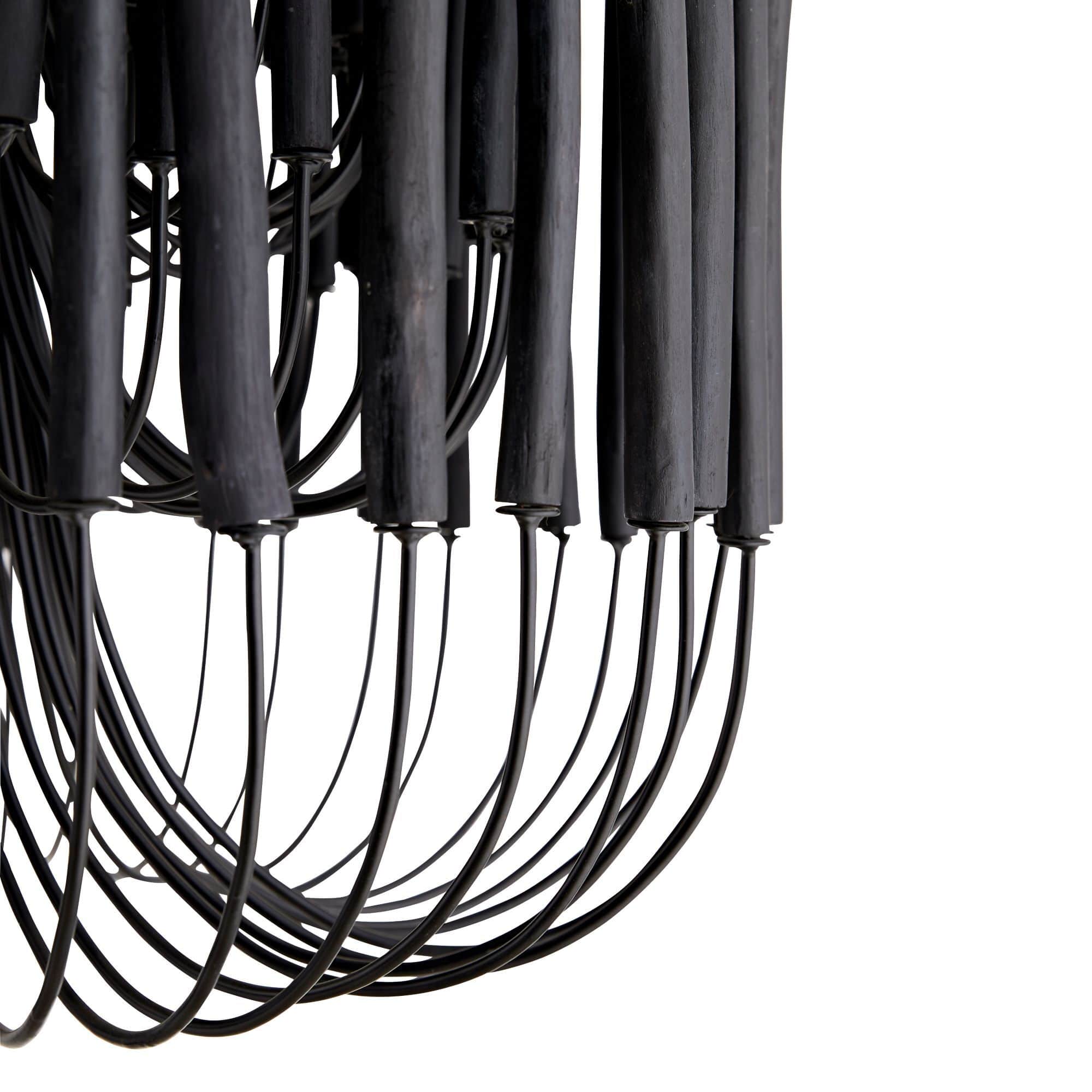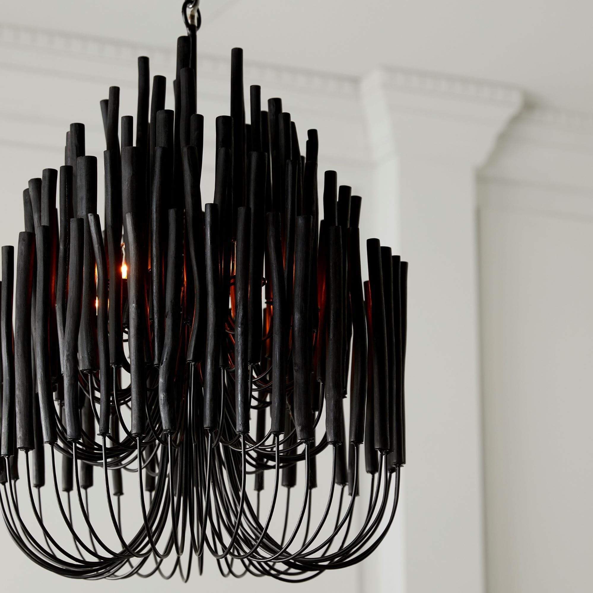 This rustically refined chandelier instantly transforms a space. The multi-tiered form features wooden dowels, finished in black, on curved and pliable iron arms. The wooden rods will arrive with a series of inherent fissures and cracks that will widen and multiply over time. This is considered a natural occurrence and is both beautiful and intentional. During installation, please ensure the bulbs are not in contact with the wooden components by gently adjusting the arms to create a one-inch minimum distance between the dowels and bulbs. Each piece will vary in size, shape, and finish.