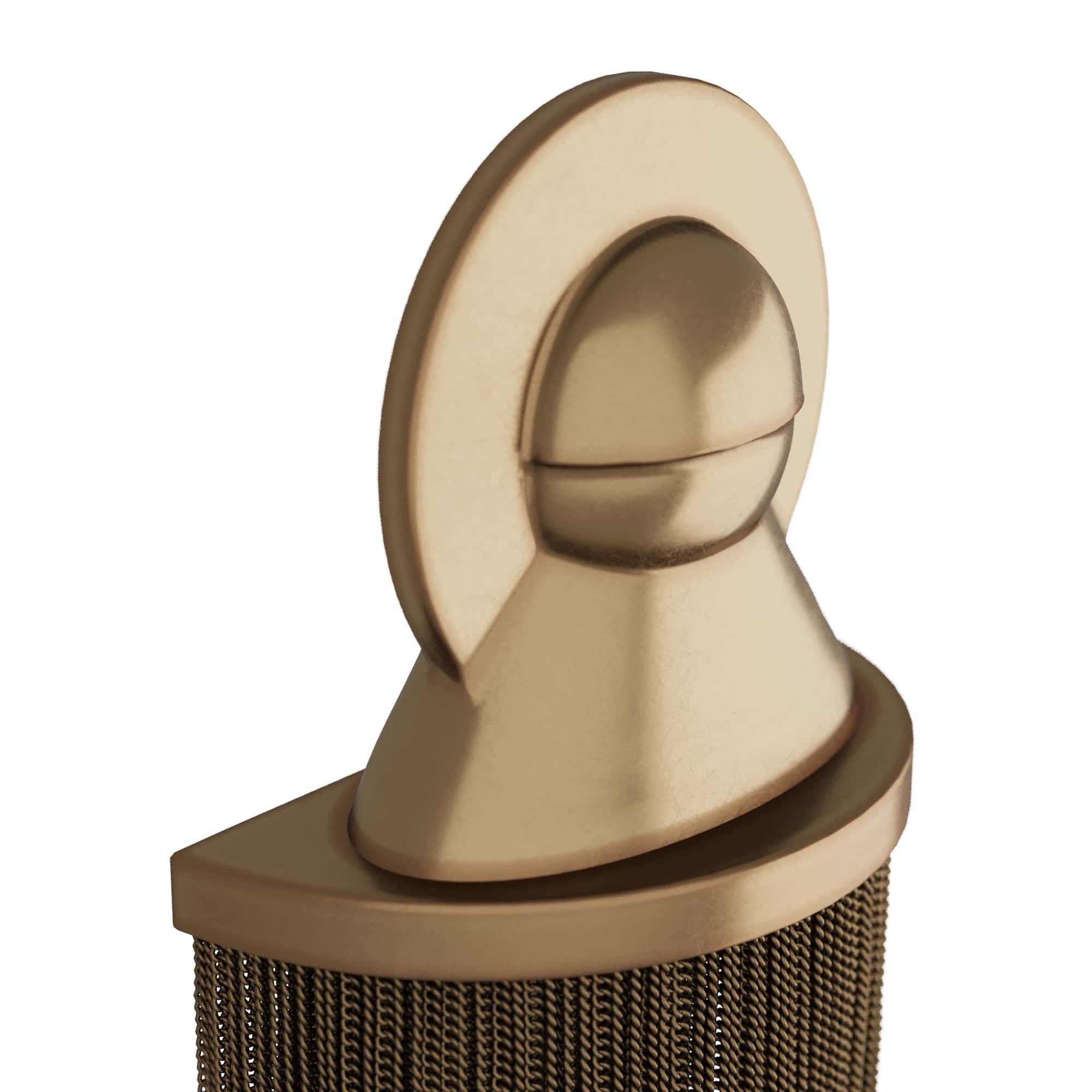 Art Deco style and a nod to Mesoamerican art, provided inspiration for the tasseled Vanko sconce. The statement piece is created with a cast, antique brass head, in an Aztec-style silhouette, and a fall of fringe created in antique-brass iron. Damp-rated, although limited covered outdoor conditions may affect finish.