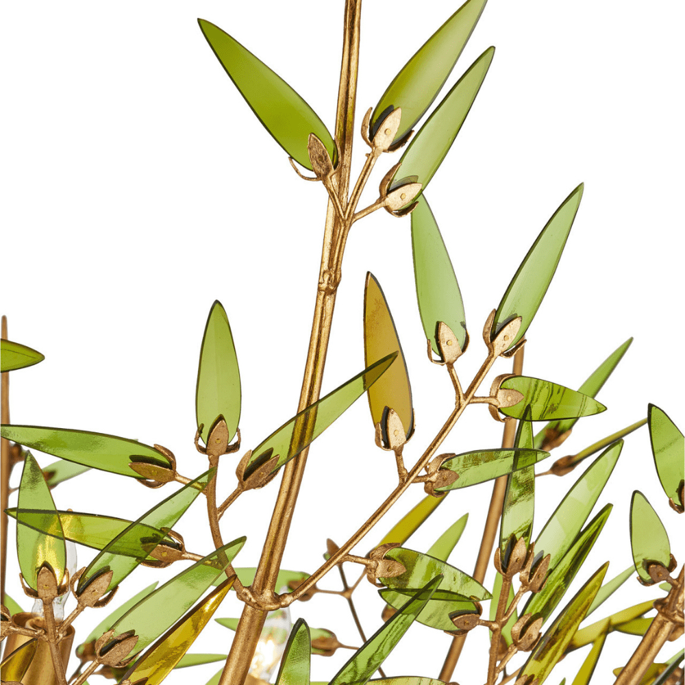 The Babylon Chandelier is formed from slender, curving stems of wrought iron in a contemporary gold leaf finish that have been shaped into an elegant bowl-like silhouette. The tapering spikes are adorned with elongated green glass leaves, each hand-cut from recycled wine bottles, that look as if they are being stirred by a breeze. The edges are individually polished by hand and placed on the frame with metal pins that resemble the shapes of the glass pieces. There will be slight variations in color in the leaves on this eight-light gold chandelier that is dimmable.
