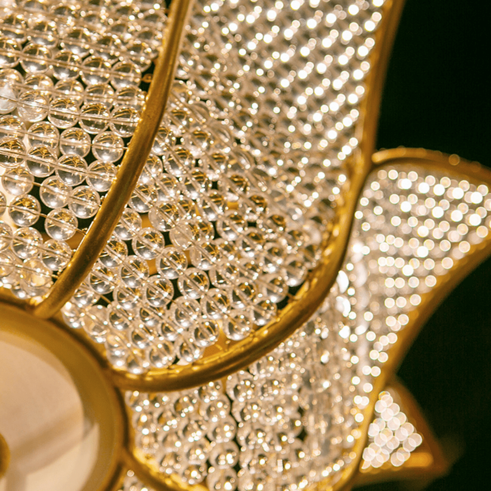 A throw-back to a time when formal salons were the most popular gathering spots for the elite, the Bebe Chandelier designed by Bunny Williams has a wrought iron tulip-shaped frame in a contemporary gold leaf finish strung with clear glass beads. The light effervesces when it passes through the small glass globes to soften the illumination that flows from this gold chandelier.