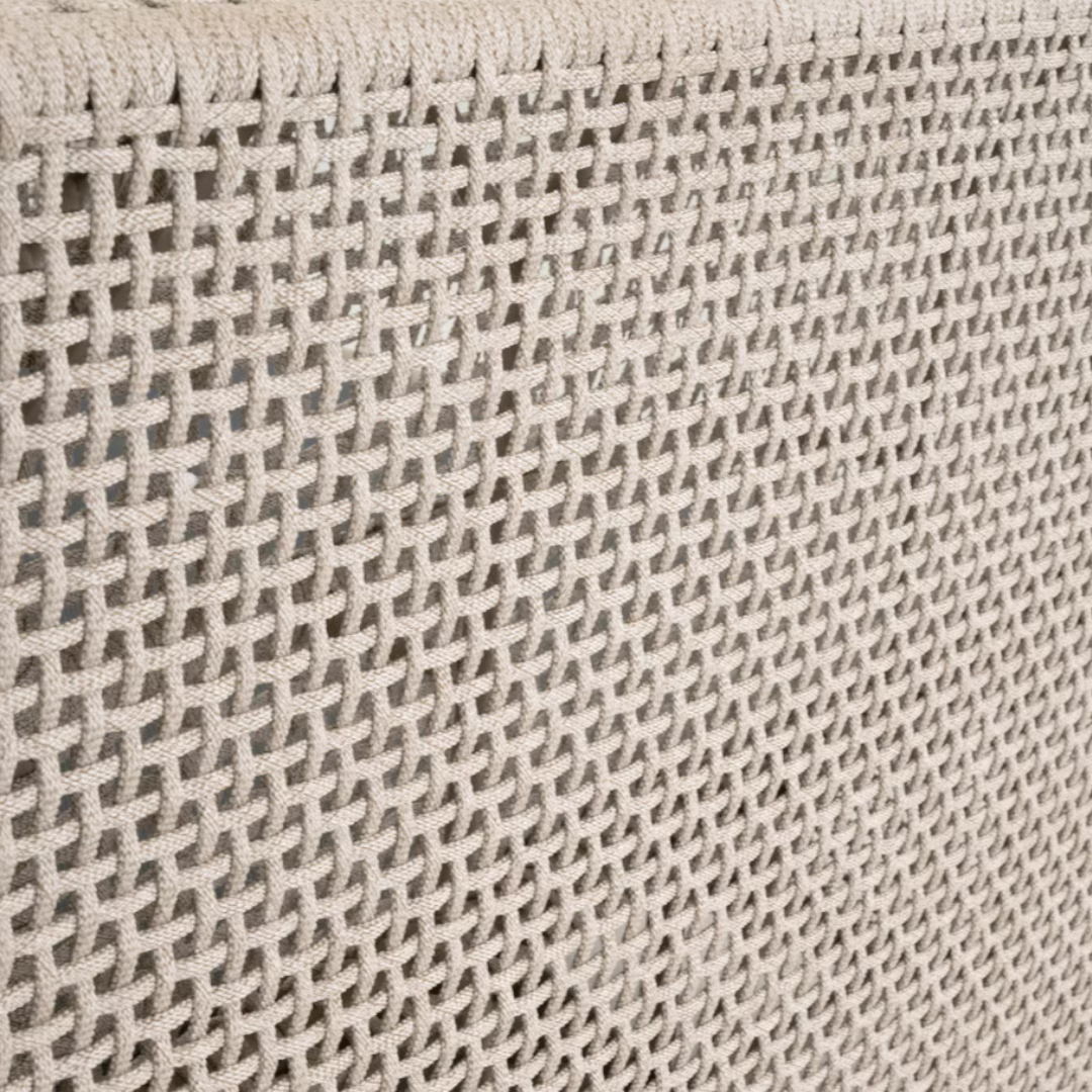 Composed of squared lines, a swivel base, and a rope frame, this alluring Tropez Outdoor Swivel Rocker Sofa Chair by Essentials For Living will be an ideal addition to your patio or outdoor living space. This chair is suitable for many outdoor designs with its beachy look and transitional style. It is upholstered with a performance ecru olefin fabric that is weather resistant. The seat and back cushions are both reversible for easy cleaning, and removable for storing away in heavy weather conditions. The full chair should be stored away in extreme conditions. The frame is covered with a hand-woven rope design. The swivel base mechanism allows this chair to both rock and spin, allowing for easy movement. The neutral color scheme and simple look of this chair exude a warm and inviting aesthetic, which is perfect for a casual and inviting backyard atmosphere.