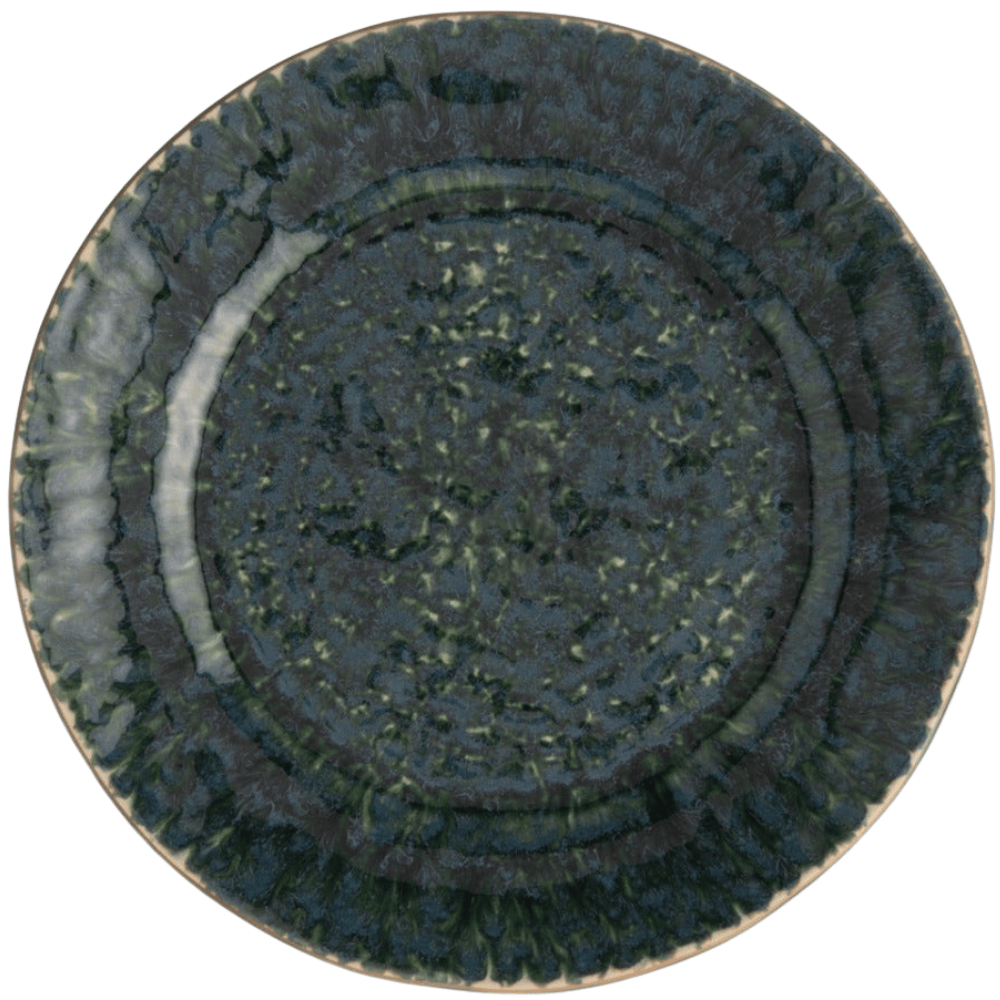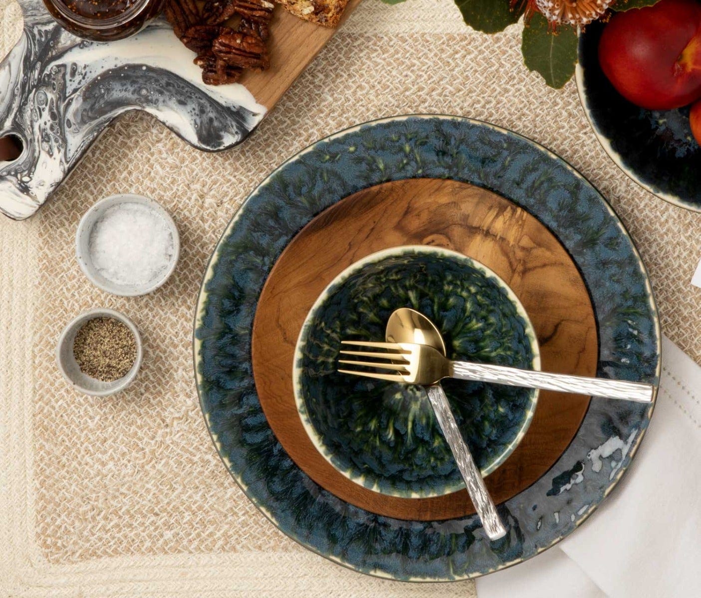 Bria's multi-layered effect isn't simply painted on by hand; take a closer look to see that this vibrant design of blues and greens is created by Teal Reactive glaze in a hot kiln. The process lets a kaleidoscope of shades pour over each plate and bowl while the natural off-white stoneware peeks out around the edges.