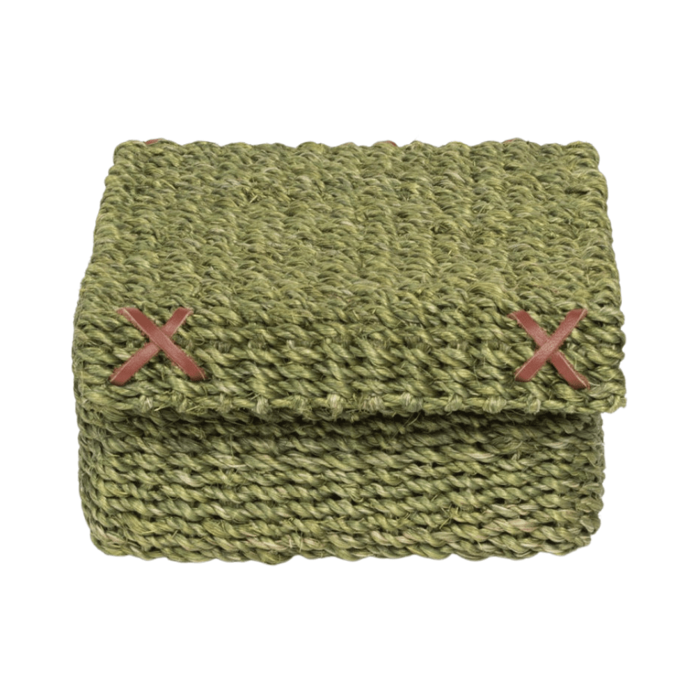 Lidded napkin holders in three sizes (cocktail, luncheon, guest towel) made from woven abaca and leather. Sold as a pack of 2.