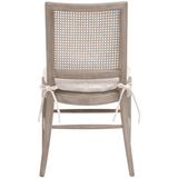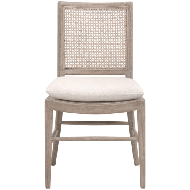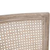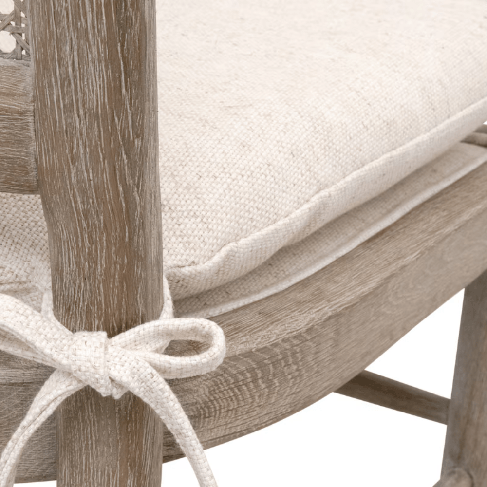The Blume Dining Chair by Essentials For Living seamlessly combines traditional design with contemporary elements, making it an ideal piece for a transitional space. Crafted with a natural gray solid oak wood frame and cane back, it provides an airy, stylish aesthetic. The seat cushion is removable with ties and upholstered in a performance textured cream linen. This material is made from a durable polyester-linen blend that is stain-resistant and designed to withstand everyday use. With a contoured seat and leg stretchers for added support, this transitional chair delivers both comfort and durability, making it a refined addition to any dining space.