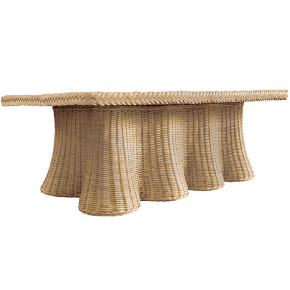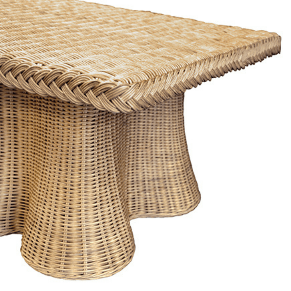 Rectangular coffee table with braided edge and scalloped skirt in natural woven rattan.