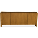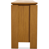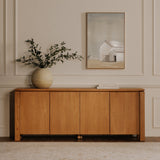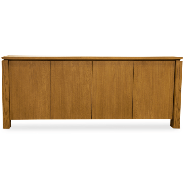 The Brook sideboard blends a blocky silhouette with a visually light, undercut top that appears to float on its strong, thick legs. Crafted from solid oak and clean oak veneer door fronts, its mid-tone brown oak finish, enhanced by wire brushing, offers a rustic flair that complements various interior styles.