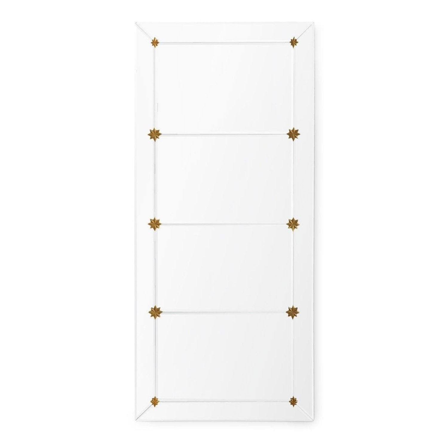 The romantic accents and soft simplicity of our Rosette Mirror nod to the elegance of a French country home. Whether you’re outfitting a cottage with provincial charm or a cozy urban space, this lovely accent brings warmth and style marked by excellent craftsmanship. Its elongated silhouette opens up a room with the illusion of extra space and light while providing the perfect reflection for your full ensemble. Four clear beveled mirror tiles are bordered by thin beveled mirror tiles and mounted on an exposed black wood base. The Rosette gets its name from the ornamental antique gold finished etoile rosettes, which dot the design, providing contrast with a dash of aged patina.