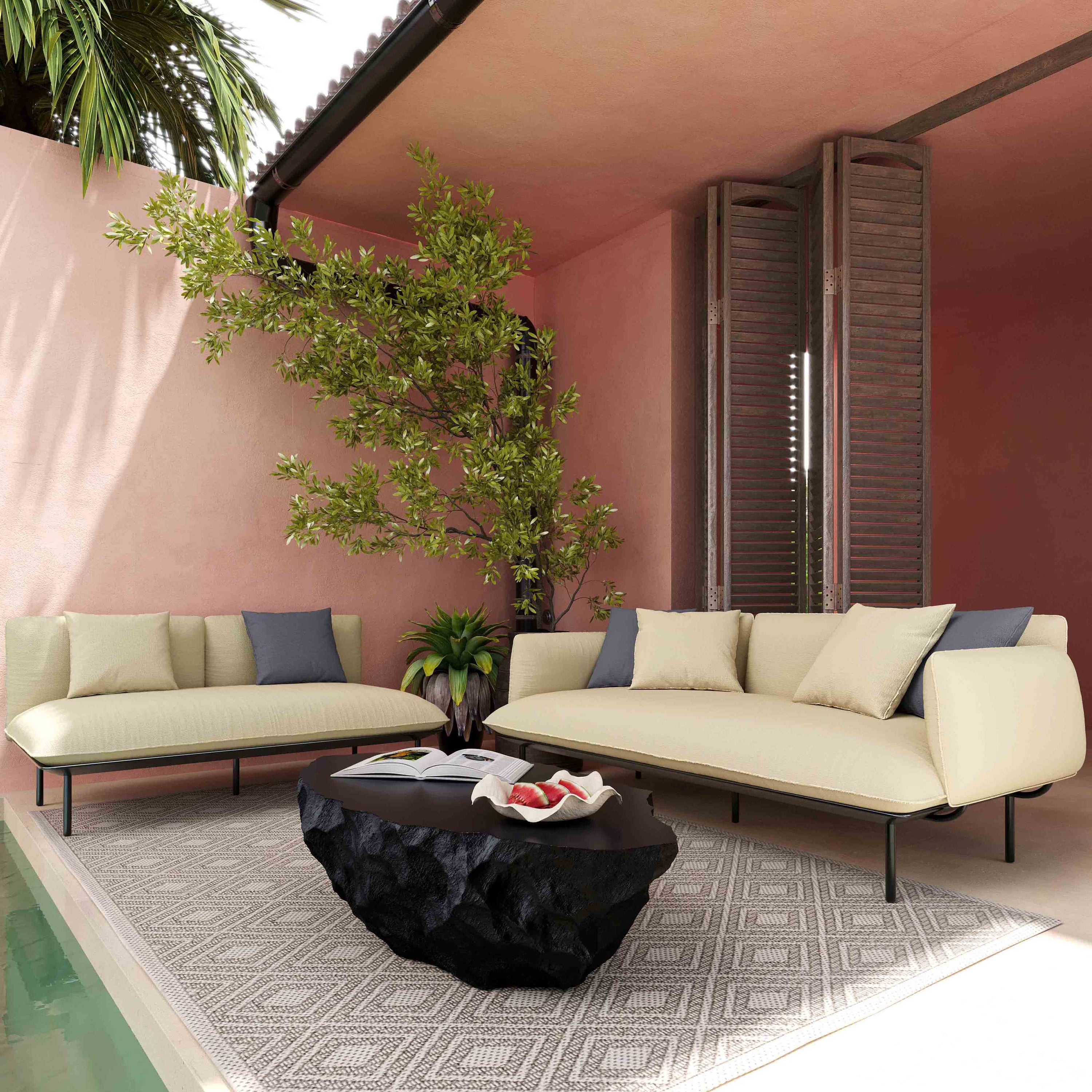 Elevate your outdoor lounging experience with the Daphne Collection; A dream for modern minimalists! Featuring an aluminum frame, neutral fabric choices, and contrasting accent pillows, this outdoor-safe collection creates a comfortable and stylish haven for relaxation.