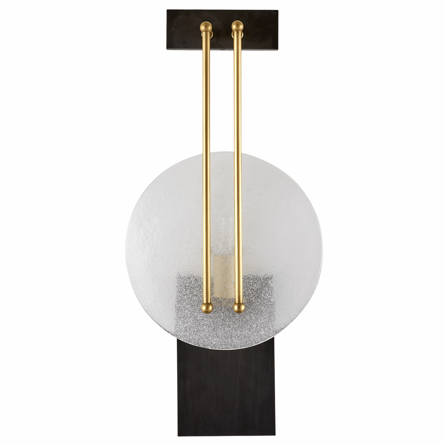 The strings of instruments such as a violin or banjo inspired the clamped and pierced structure of the Clover. Held by accents of antique brass-plated steel, a disc of clear seedy slump glass diffuses a single bulb. Mounted on double bronze steel panels, it is an ideal mix of material and shape.