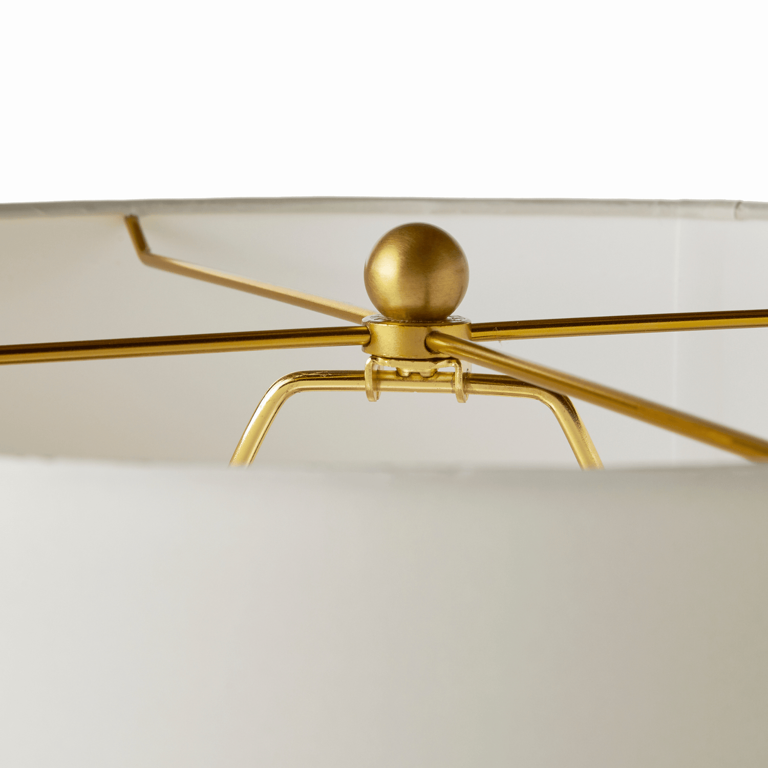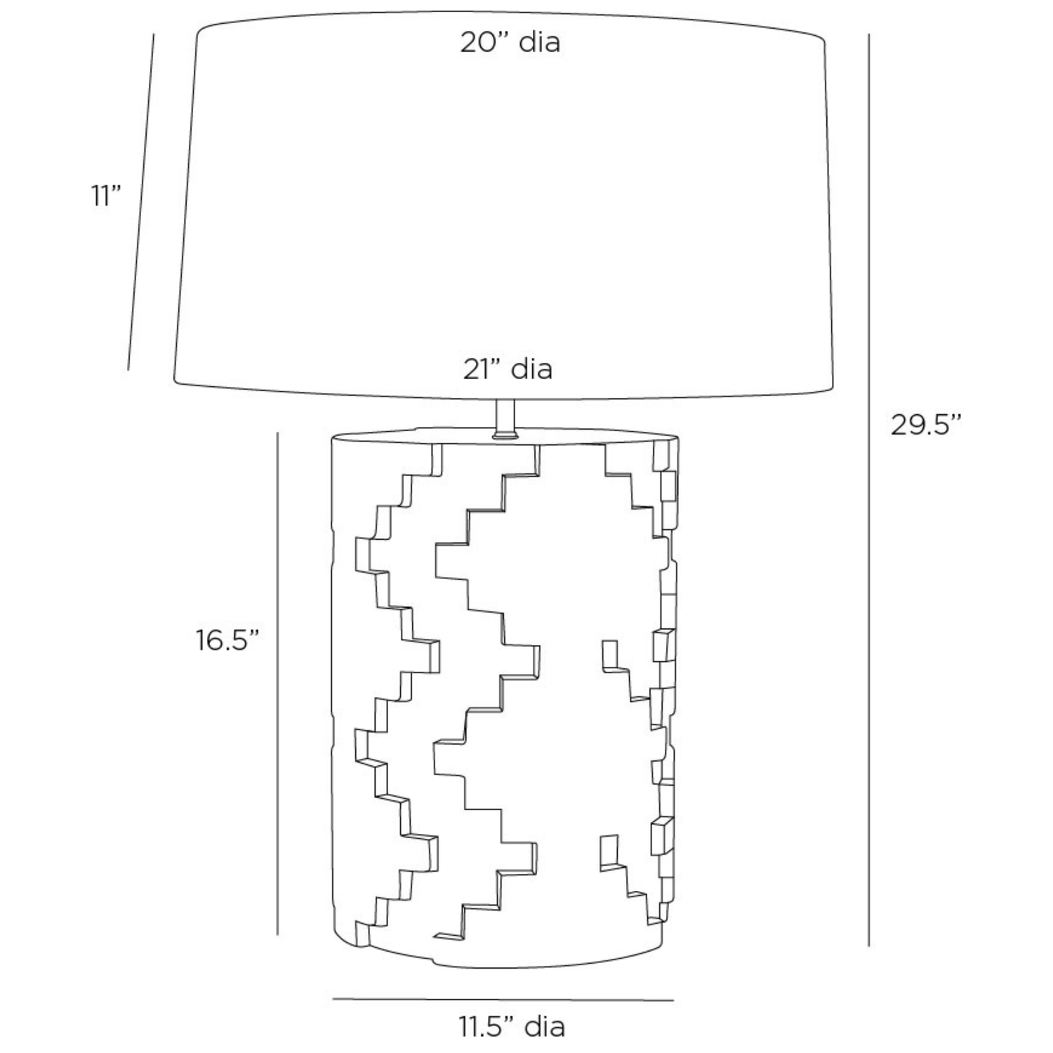 The stair-stepped texture of our faux travertine resin column embraces the forms of classical greek architecture. Each chevron detail delivers a herringbone effect when illuminated underneath the ivory microfiber drum shade. Antique brass hardware. Finish will vary.