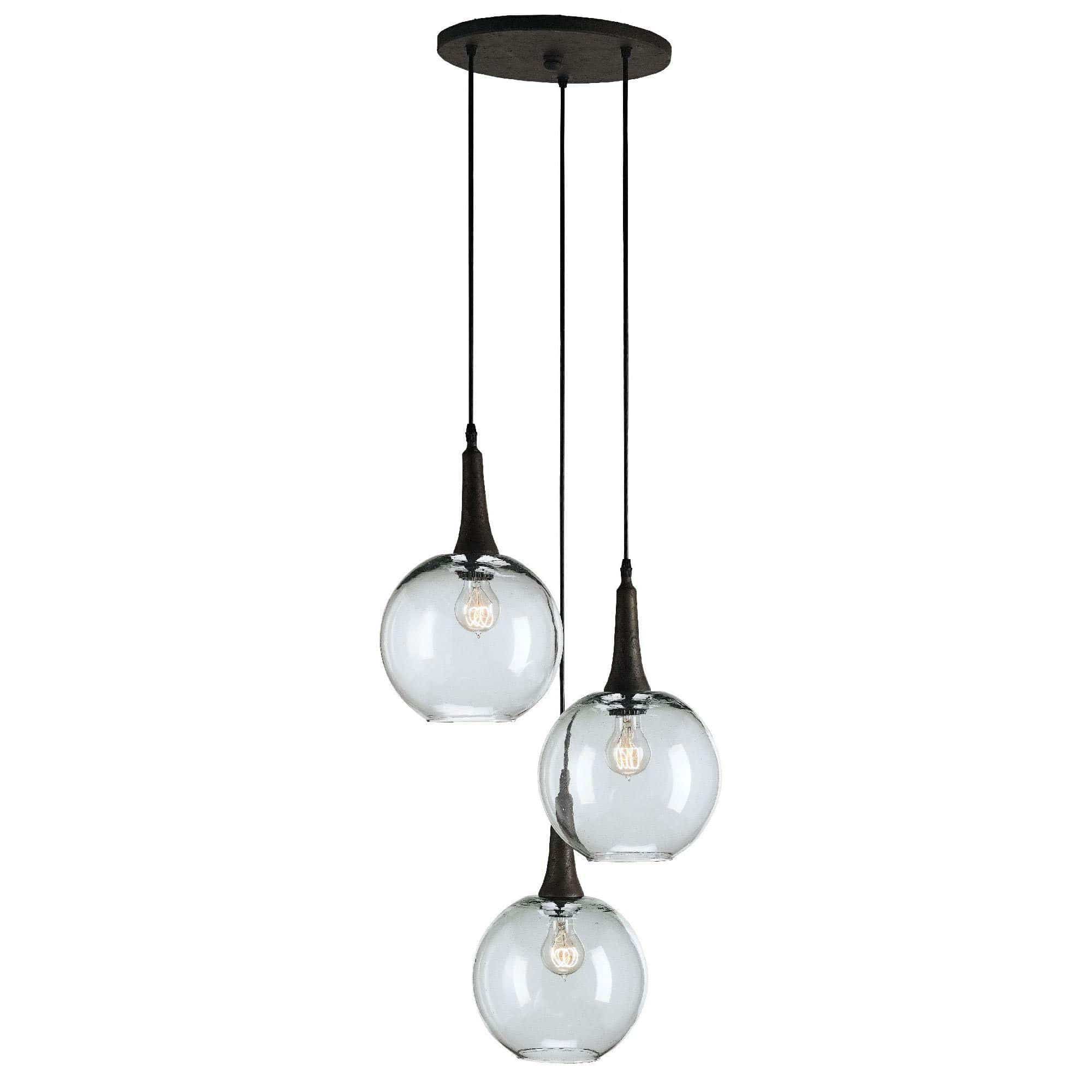 Design notes that make the Beckett Trio Pendant special are how simply the voluptuous glass spheres dangle at differing heights, the Emery rust finish on the wrought iron that serves as a contrast, and the slightly gray tone of the glass that is tonally perfect melded with back.