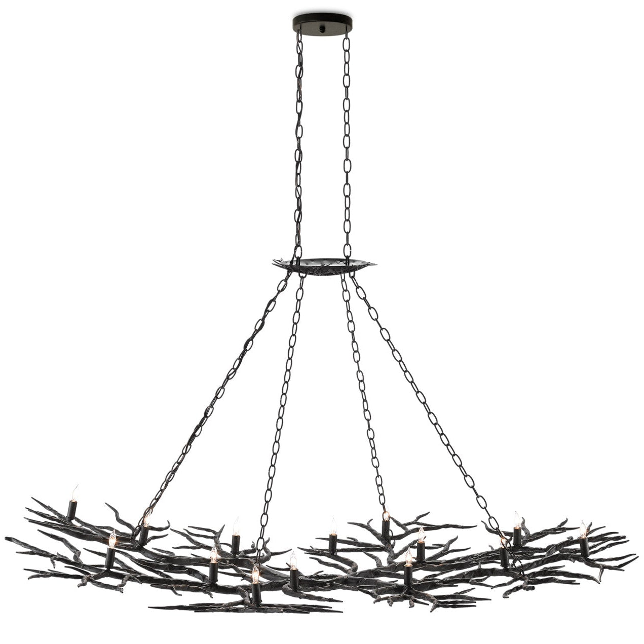 This bronze version of our Rainforest Chandelier may bring out Mother Nature's jealous streak given the fixture has transformed one of her most poetic perennials into elemental illumination. Fourteen lights are nestled within the hand-forged iron branches that form the arms of this fixture, each limb treated to a rustic bronze finish.