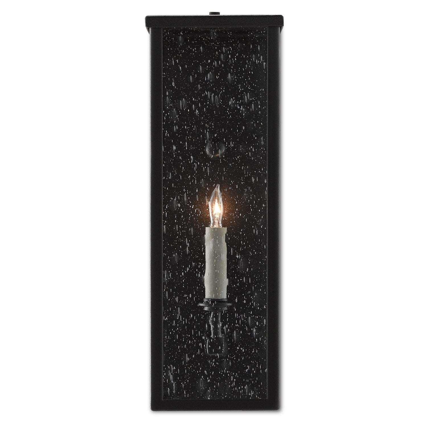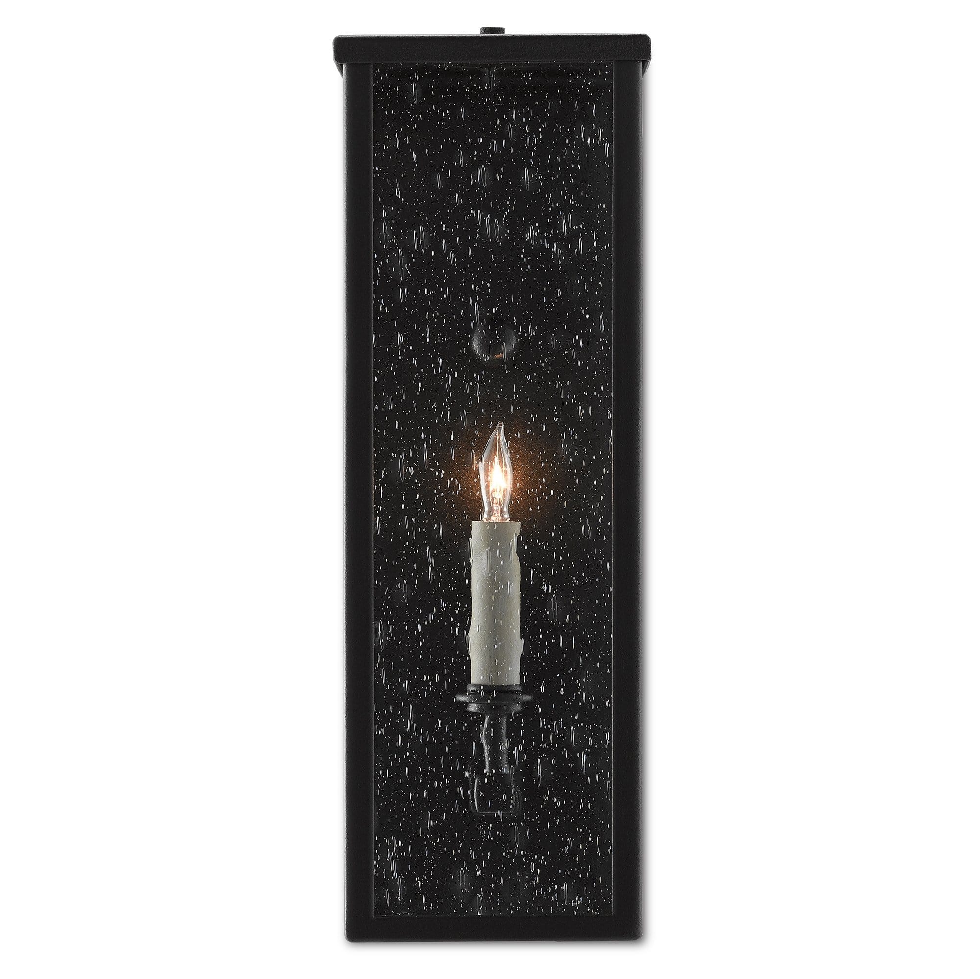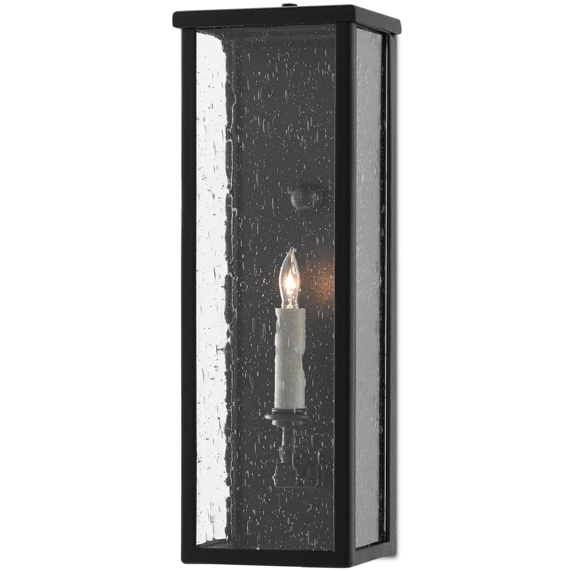 The Tanzy Small Outdoor Wall Sconce is one of a number of fixtures in our Twelfth Street collection of outdoor lighting that features a Trilux finish, the next generation of high-performance, weather-resistant finishing technology brought to the market exclusively by Currey & Company. The coating provides three levels of protection, and is fade-resistant, crack-resistant and rust-resistant. We guarantee the finishes applied to our Twelfth Street pieces for five years. This black outdoor sconce has been treated to our midnight finish that surrounds seeded-glass panes, which turn the illumination to a soft glow. It is certified for outdoor and damp locations