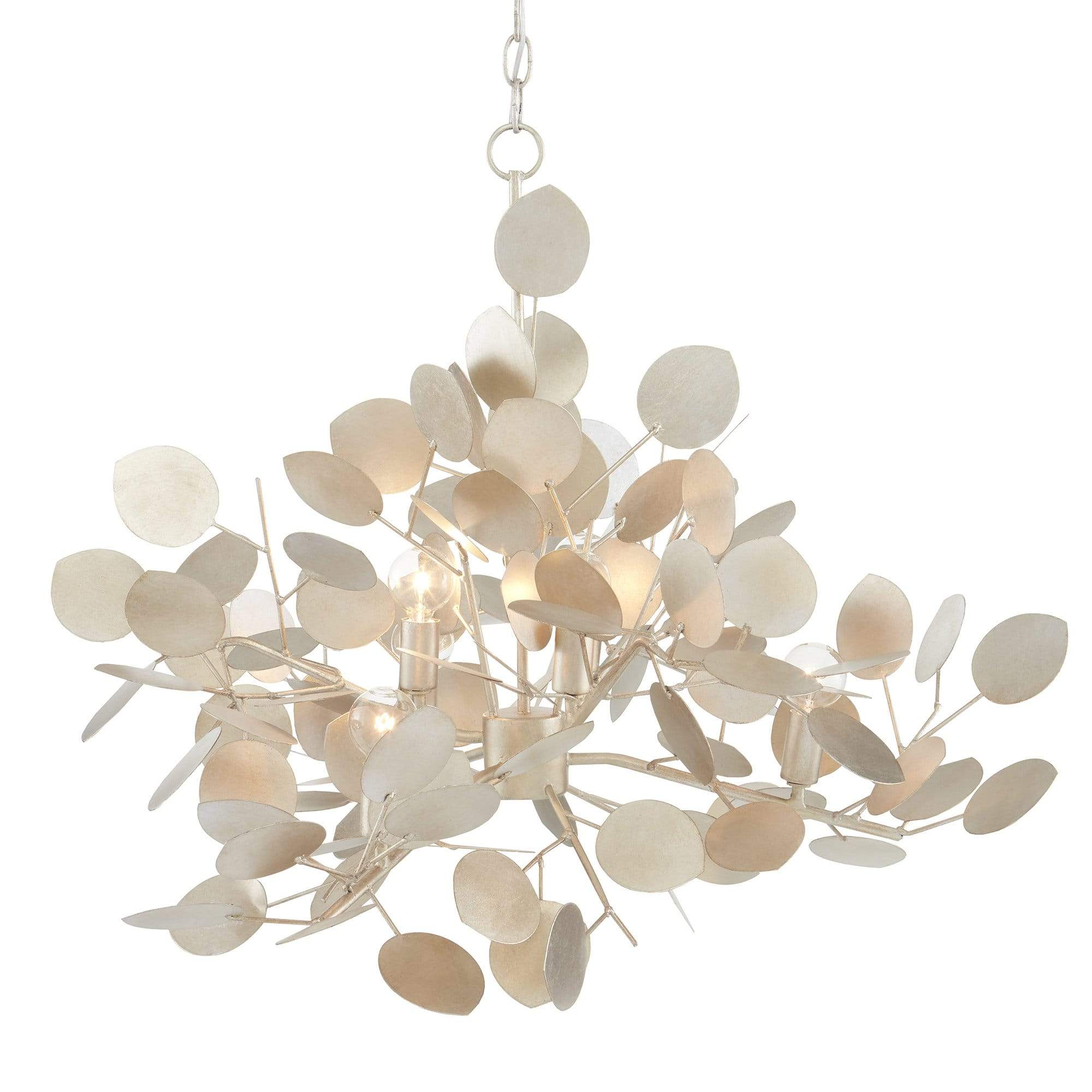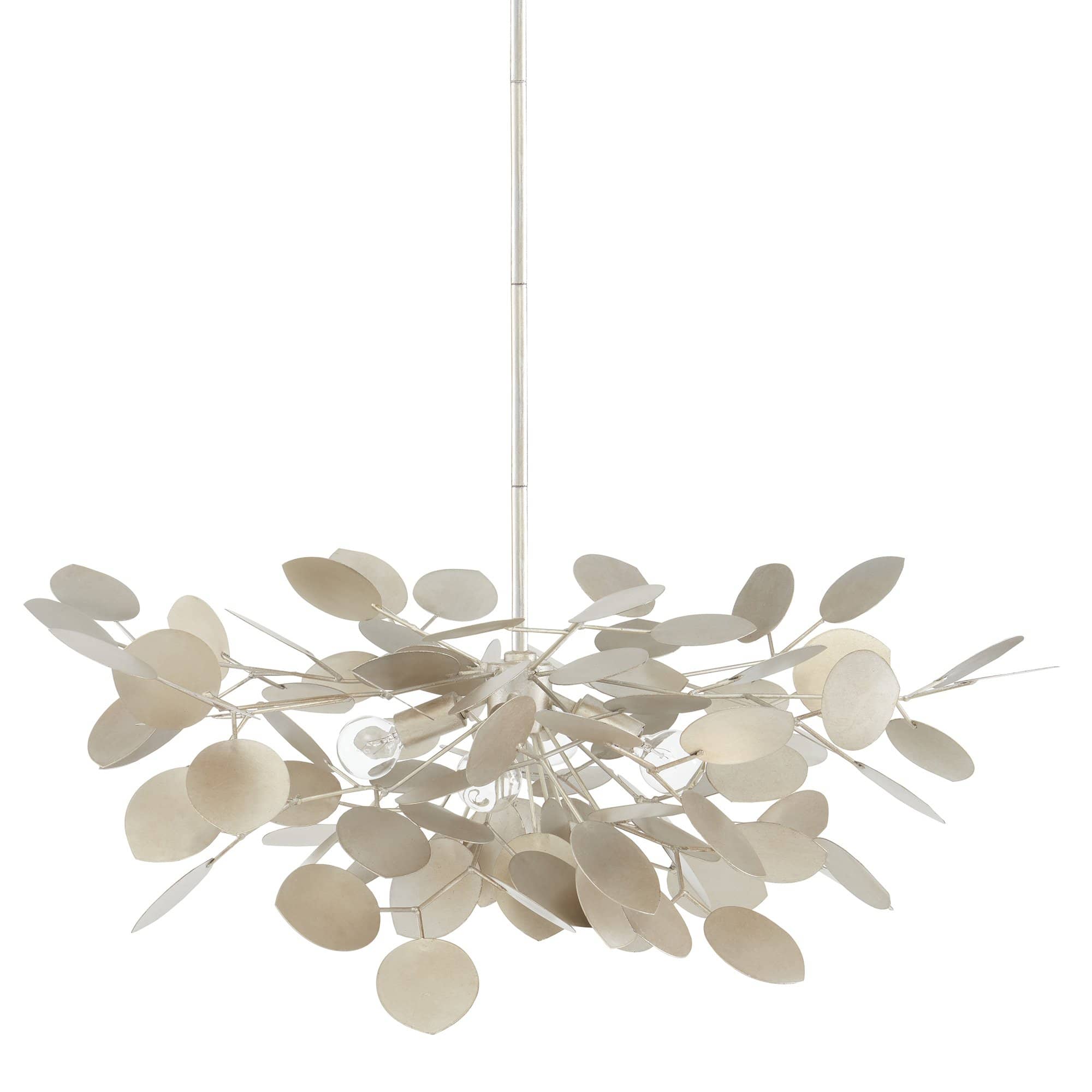With a lyrical profile of fluttering discs that favor the leaves of its namesake plant, the Lunaria Chandelier is made of wrought iron in a contemporary silver leaf finish. The bulbs that are sprinkled amongst the flowing petals of metal reflect off the finish on this silver chandelier to increase the glow. We offer the Lunaria in three chandelier shapes—oval, a large round, and a small round.