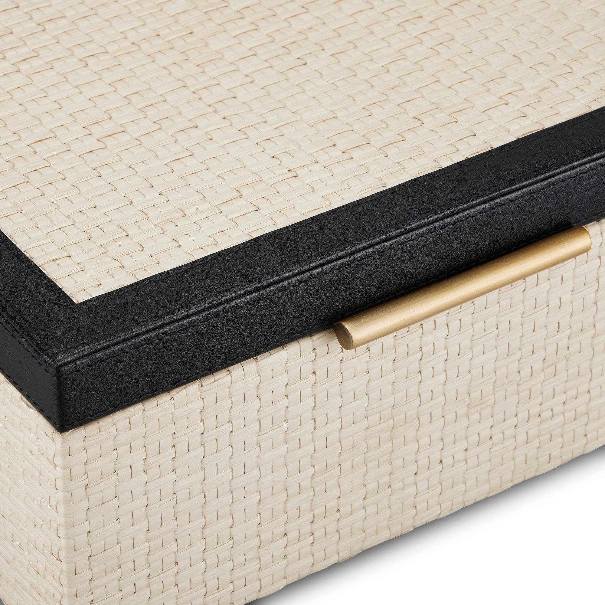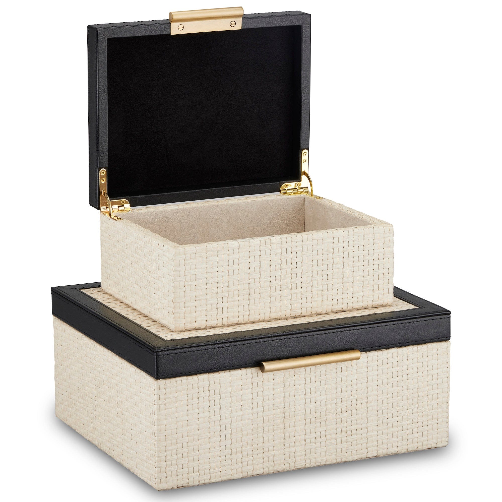 Made of intricately woven ivory raffia, the Deanna Box Set includes two sizes of decorative boxes with black leather tops, and light antique brass handles and hinges. The interiors of these black and ivory boxes are lined with beige micro suede for a luxurious feel. The uniformity of the weave on these boxes is created during a painstaking artisanal process.