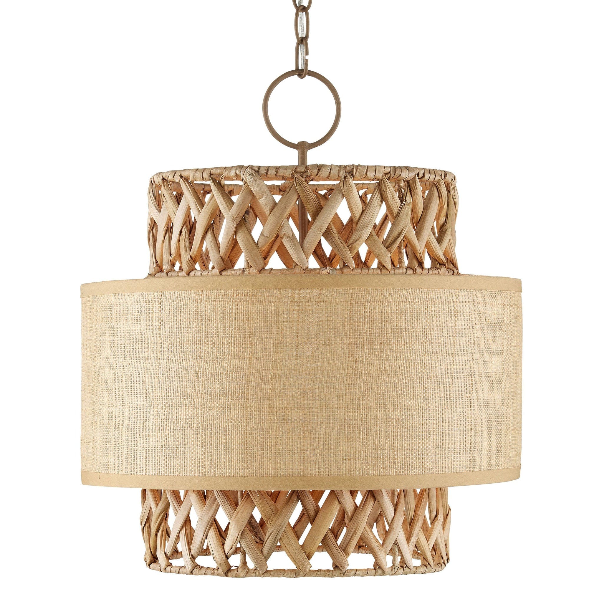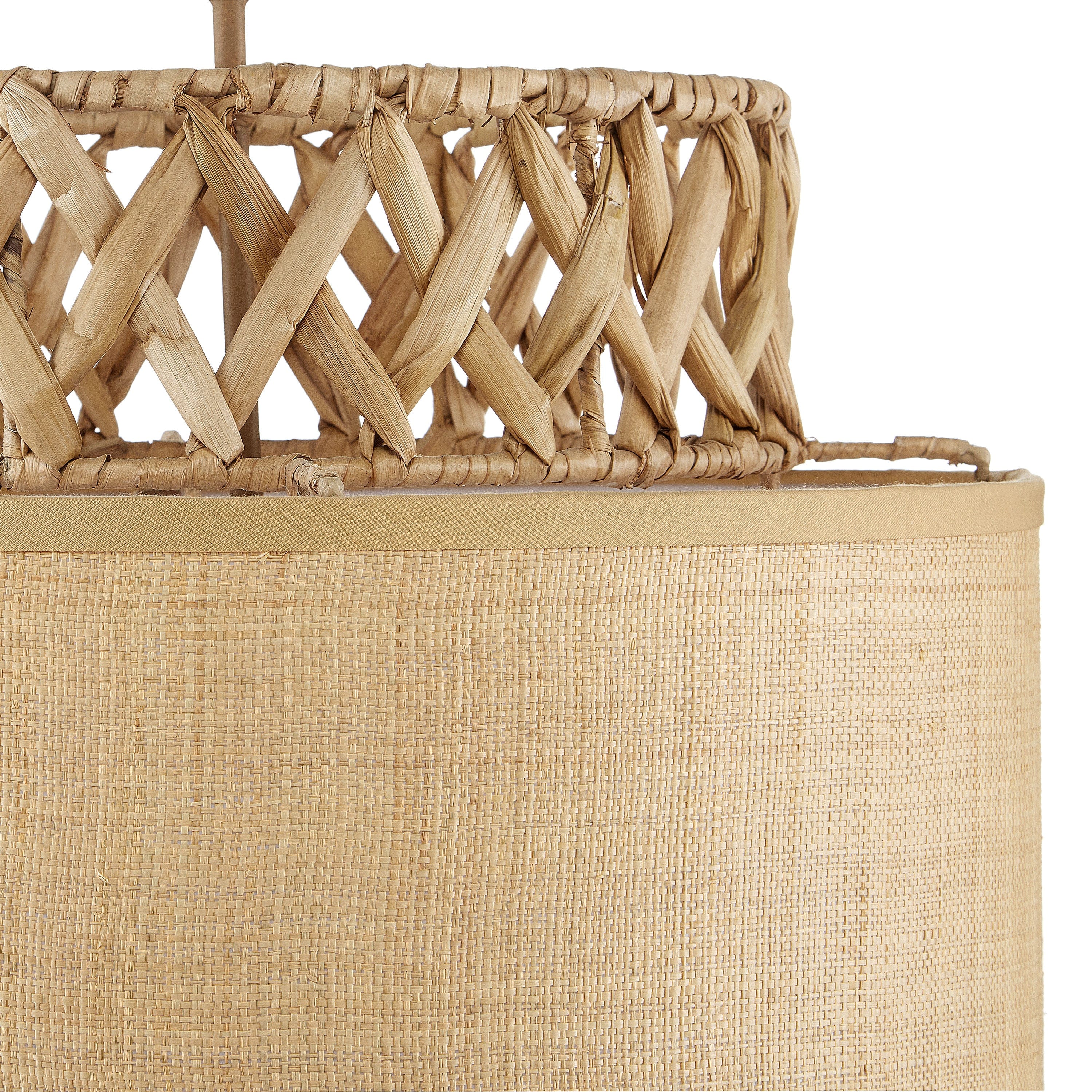 The natural material story continues with the Isola Pendant with its wrought iron frame in a khaki finish and mix of natural water hyacinth and Grass Cloth fabric. Designed by Clarence Mallari, the smaller, taller cylinder that encircles the light has a rough luxe weave of the water hyacinth; while the wider, shorter cylinder has a tighter weave that juxtaposes the looser crosshatching on this tan pendant. Both the interior and exterior of the inner geometric form are finely finished to create a refined and sophisticated product.