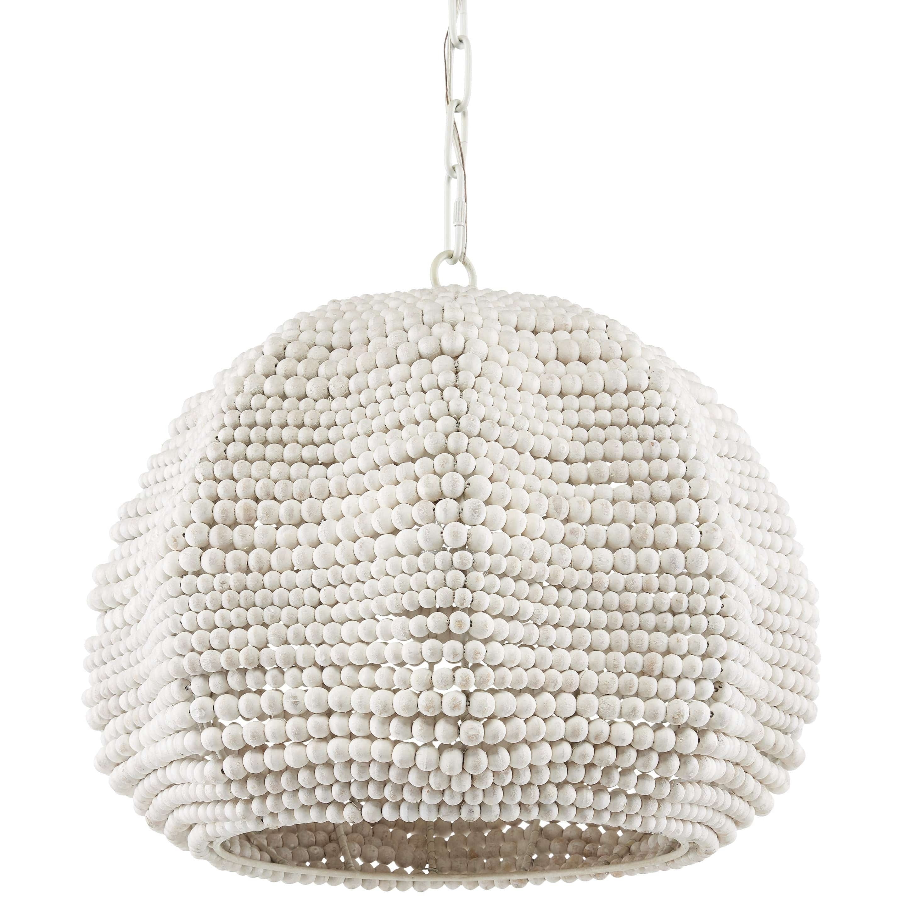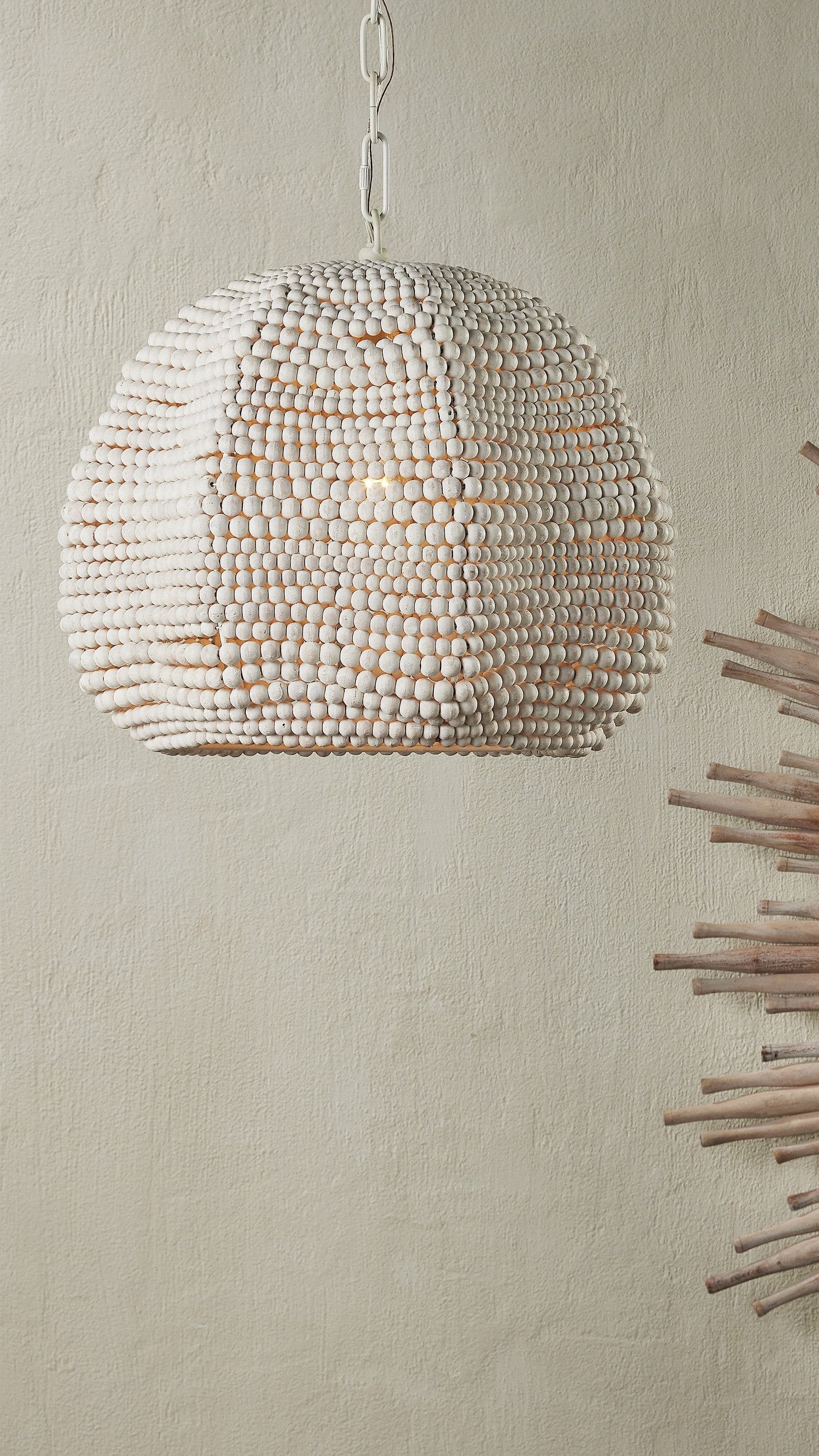 The Octavia Pendant has a flowing profile made of wood beads that have been whitewashed and strung along metal wire so that the shape will remain whimsical. This white pendant fits perfectly within the coastal design aesthetic that is sought after for interiors. The desire for casual elements that hold up to the highest design standards is driving this movement.